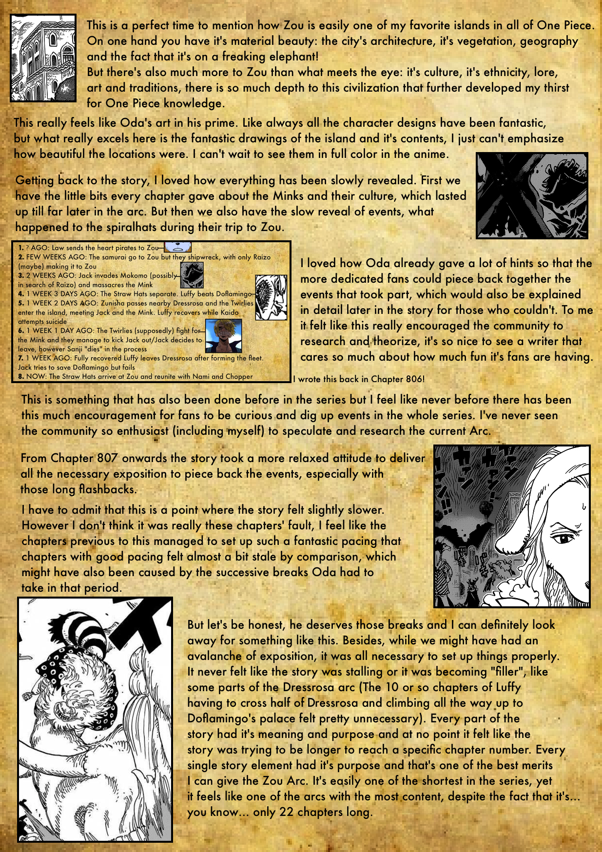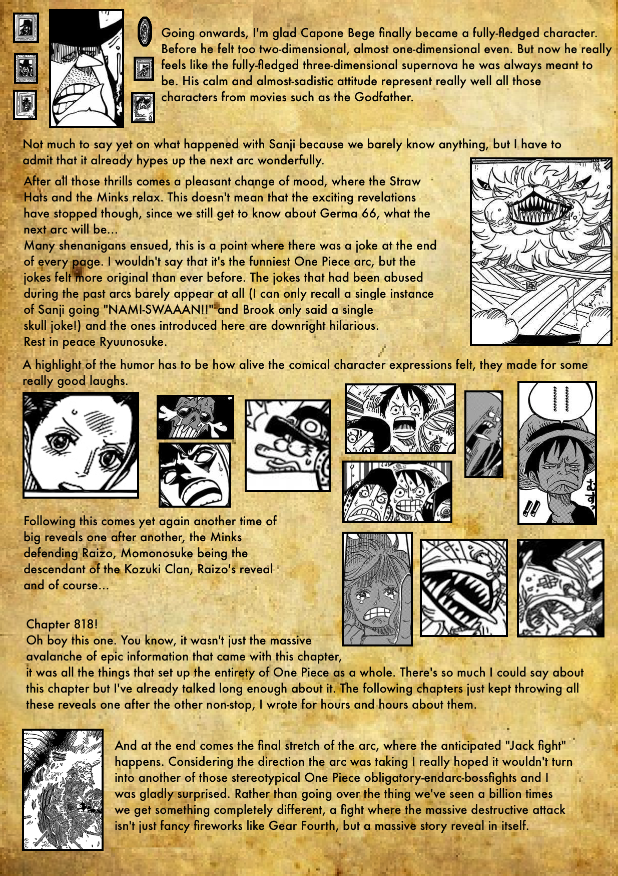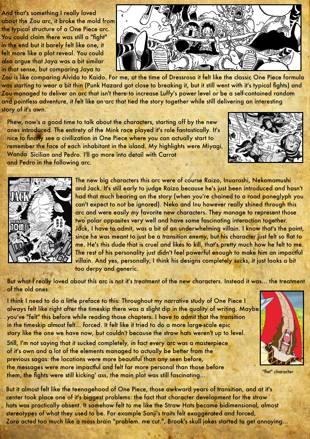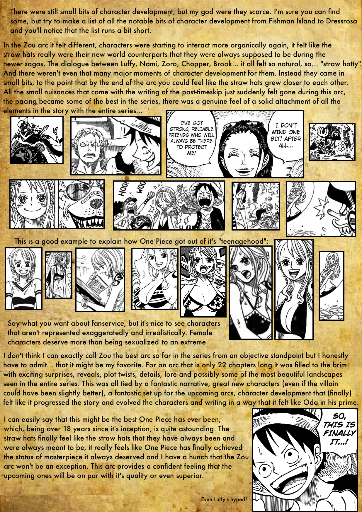 1. I didn’t get the part where you say: “Say what you want about fanservice, but it’s nice to see characters that aren’t represented exaggeratedly and irrealistically. Female characters deserve more than being sexualized to an extreme”. Because that’s just what I see in Nami and Robin on this post time skip One Piece, just like you said, it’s really escarce the times they do have some development in comparission to the time when they’re just being ‘HUGE BOOBS’ who run. (Just like Zoro were an Mosshead “Problem? Fight!” for a long time in the post time skip). I love One Piece, but I have a really hate for that kind of thing that Oda KEEP doing to them (just like that stupid bs of “women only fight with women”, I think it’s less than 5 times in the whole series that we had an trully woman x man fight (I mean of a REAL fight, like Baroque WORKS/CP9) most of the time Nami and EVEN ROBIN, an super cool “assassin” just give support in the fights.