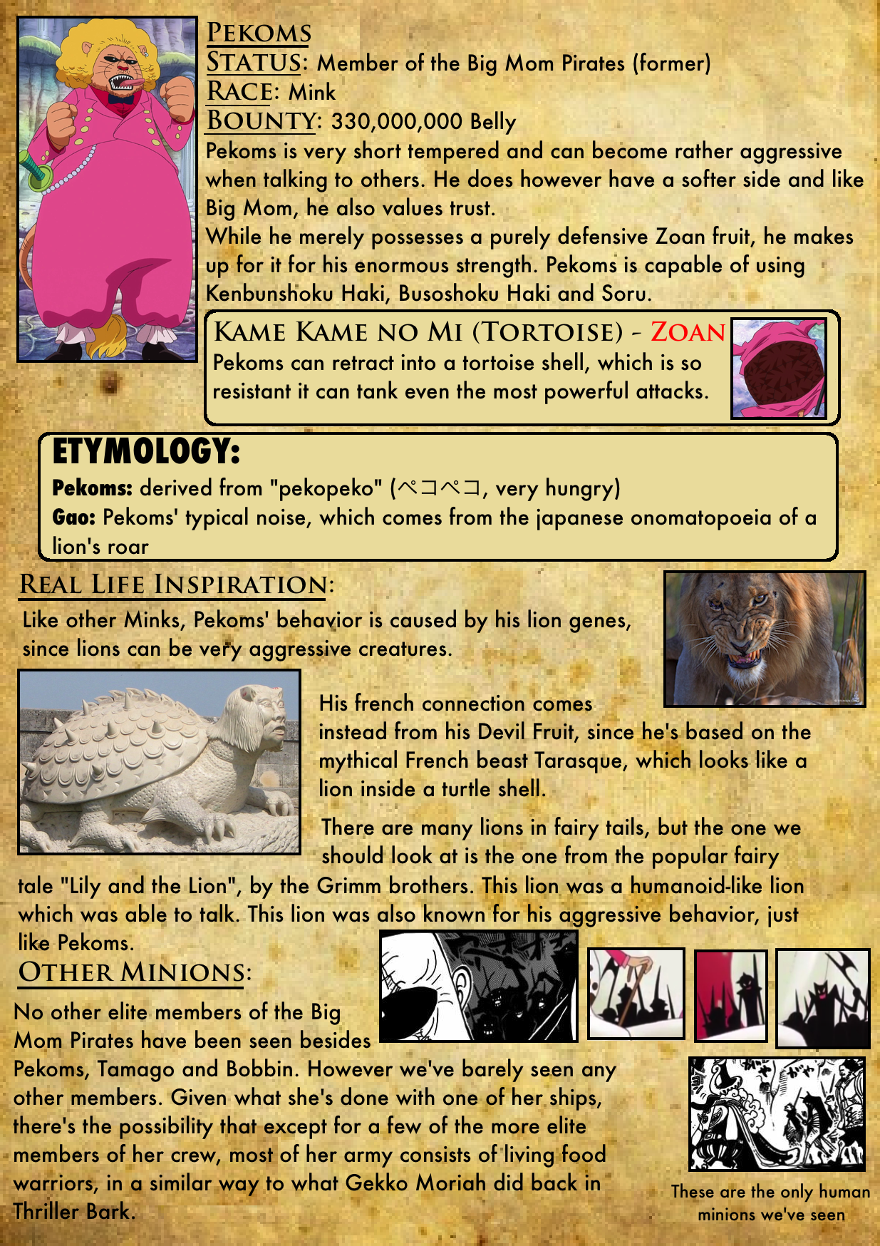 (Busoshoku è stato confirmato, (visto che Pekoms era riuscito a colpire Caribou, un logia, persino indicando di avere utilizzato haki). La parte di Kenbunshoku era speculazione da parte mia, già che i suoi riflessi sembravano indicare che avesse quel tipo di haki.)