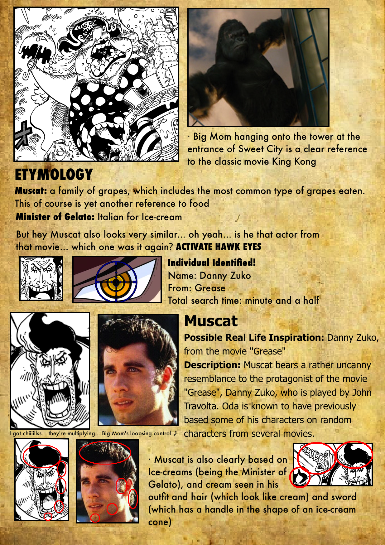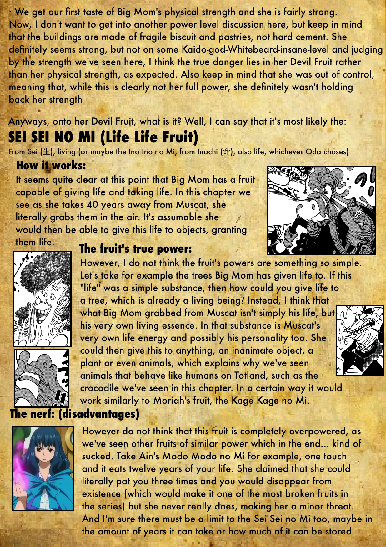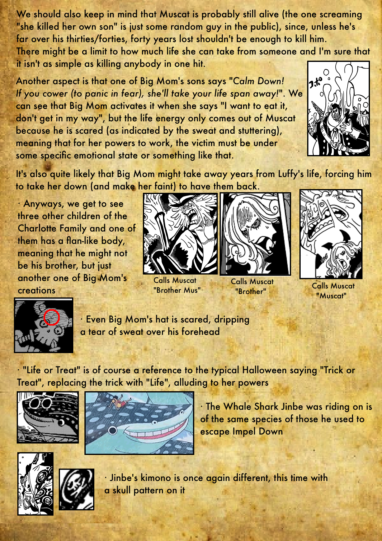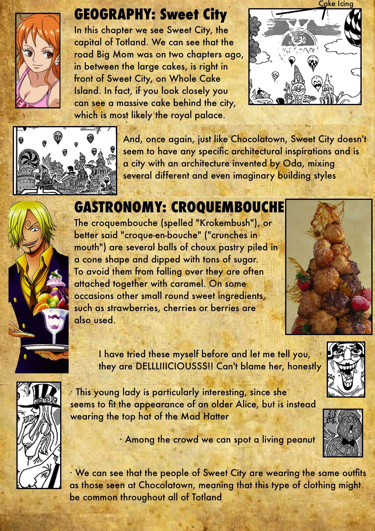 1. Well done! Excellent work as always! Something else I noticed though. Was the that the Pastries in the the Croquem Bouche seemed to talk VERY similarly to Purin. I mean they were super against being eaten, until they were complemented on being delicious, then they were very pleased with themselves. They’re even smiling in her mouth as they’re being broken down by her saliva. Very reminiscent of Purin being mad at Luffy and Chopper for eating her Cafe, until they said it was delicious, then she was to pleased with herself to stay mad. Some people have brought up the idea that Purin may have been created by Big Mom using her Devil Fruit, and this could potentially give credence to that.