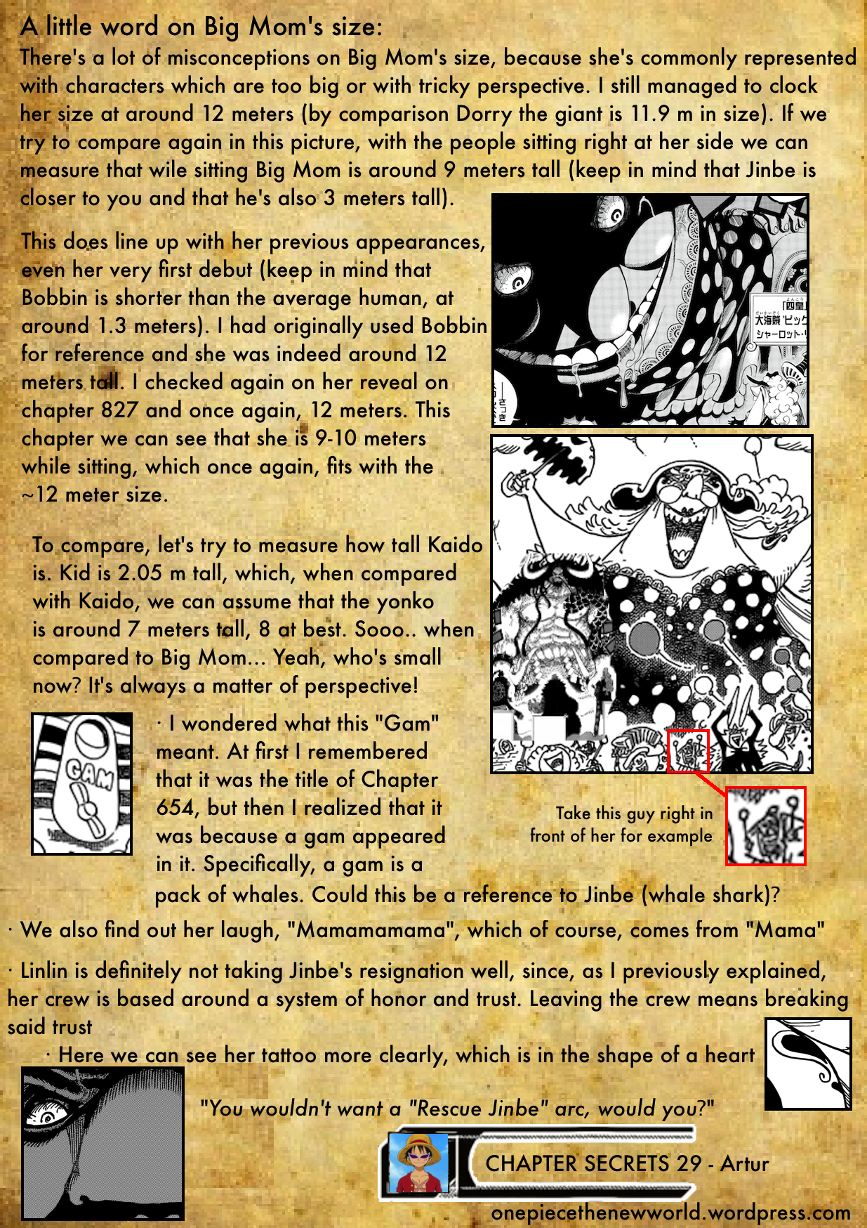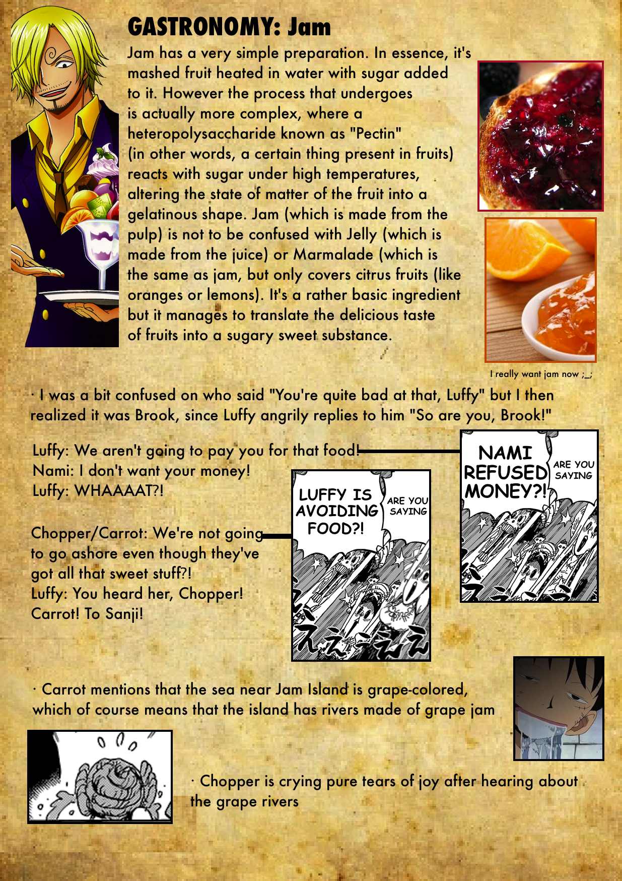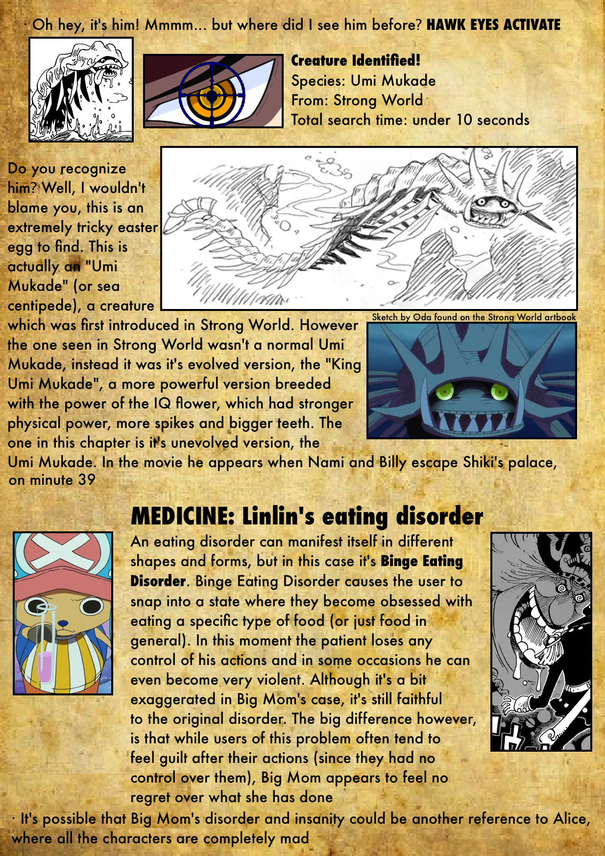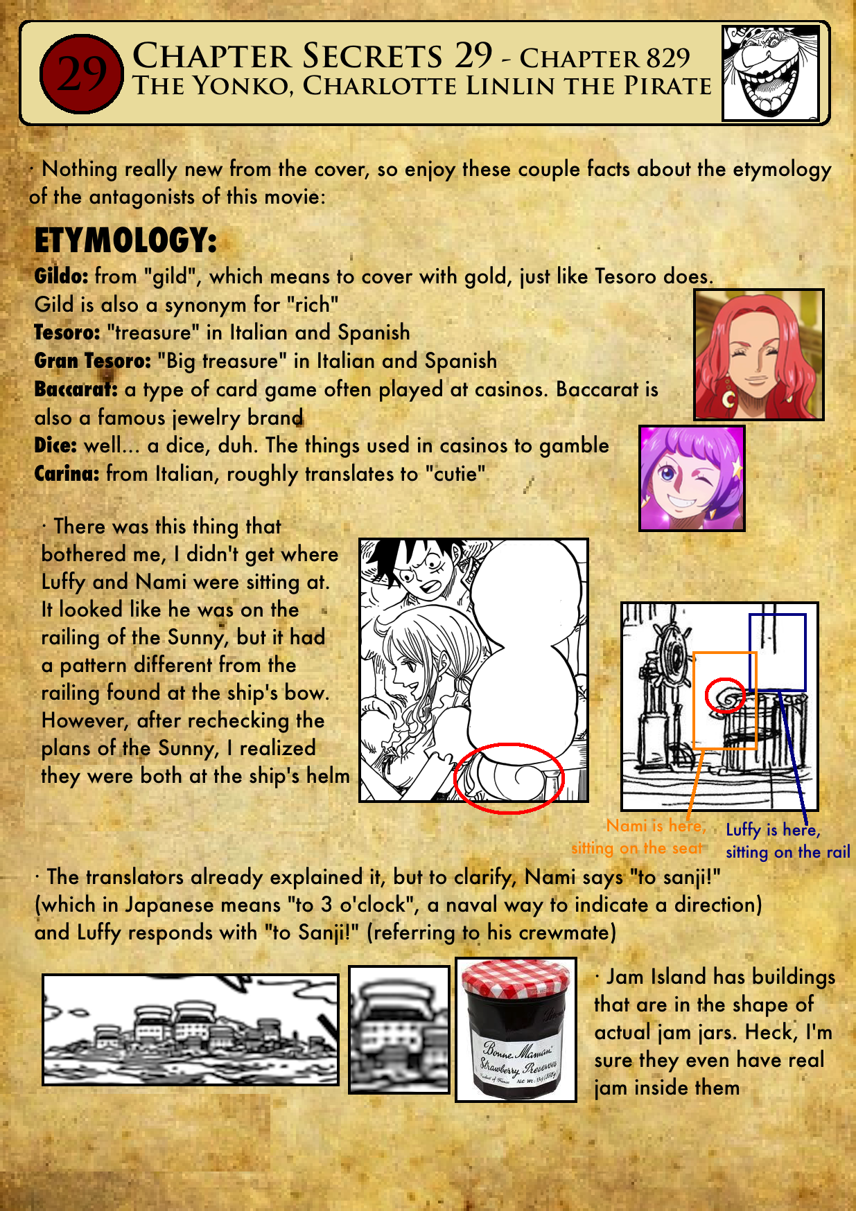1. Well done! Excellent work as always! Something else I noticed though. Was the that the Pastries in the the Croquem Bouche seemed to talk VERY similarly to Purin. I mean they were super against being eaten, until they were complemented on being delicious, then they were very pleased with themselves. They’re even smiling in her mouth as they’re being broken down by her saliva. Very reminiscent of Purin being mad at Luffy and Chopper for eating her Cafe, until they said it was delicious, then she was to pleased with herself to stay mad. Some people have brought up the idea that Purin may have been created by Big Mom using her Devil Fruit, and this could potentially give credence to that.