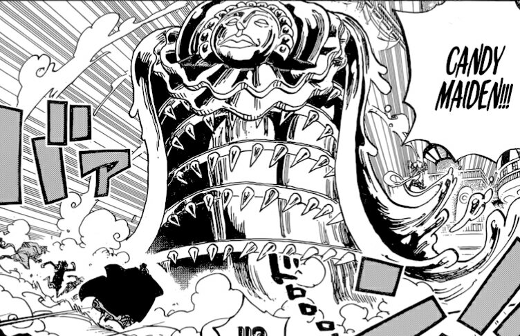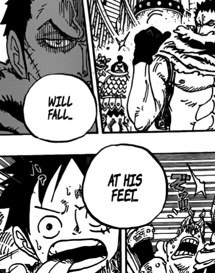 I love this juxtaposition, Katakuri claims Luffy is a monster, but Luffy’s panel depicts him derpily with his tongue sticking out. Classic Oda!