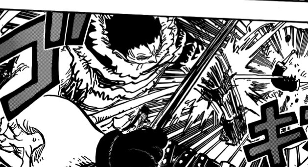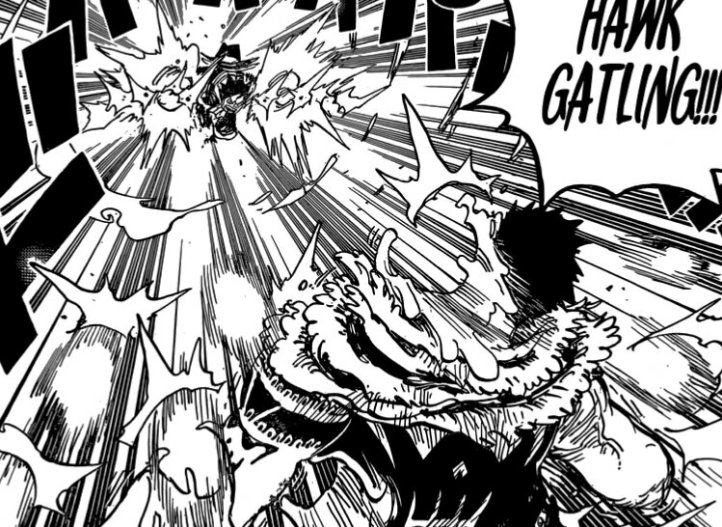 Wait… did Katakuri just… show immunity to a haki punch?!!! Is this a mistake? Red Hawk is a haki-imbued attack after all. Actually… I’d say this might be Haki immunity after all. Hear me out: this is something we haven seen before: in chapter 574, we saw Marco and Vista cut through Akainu’s jaw, using Haki, but it reformed afterwards with no problem.