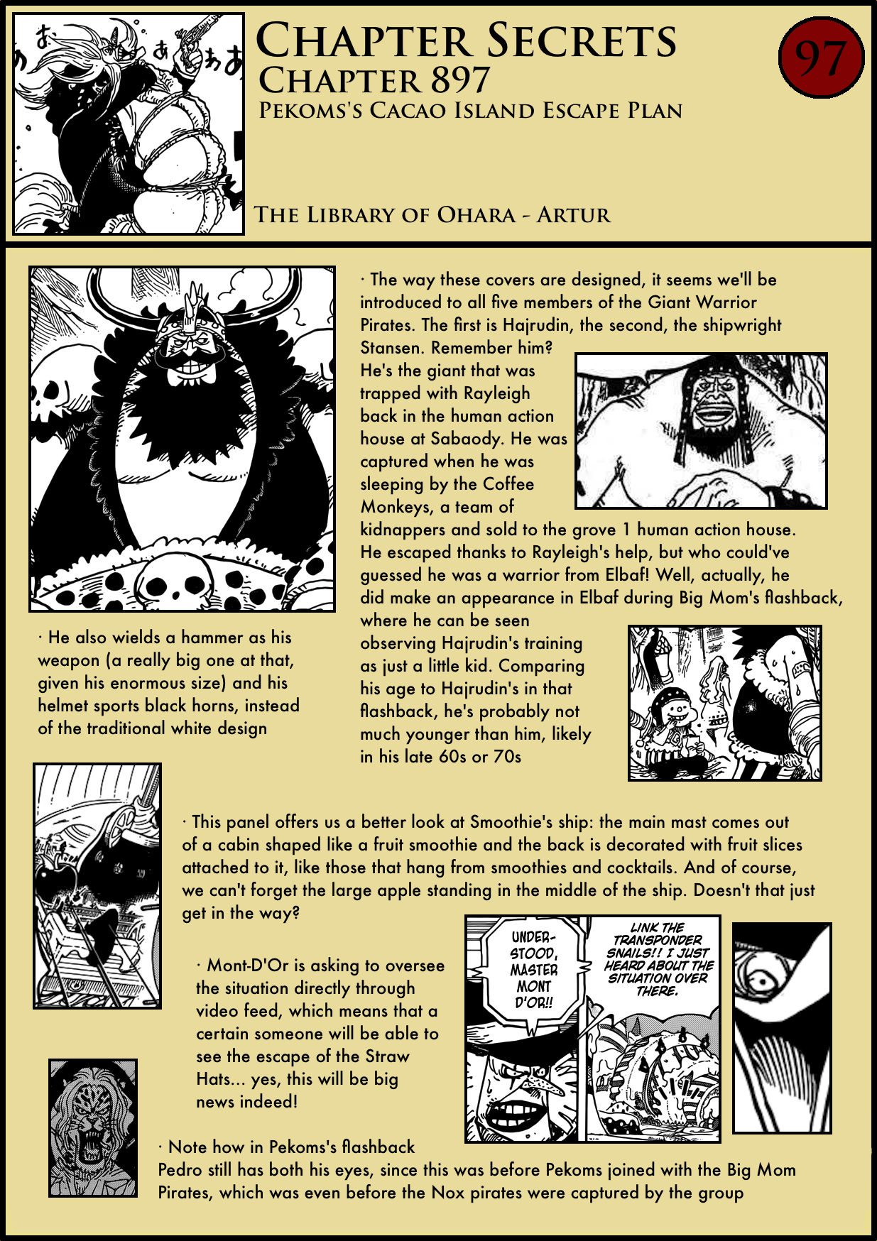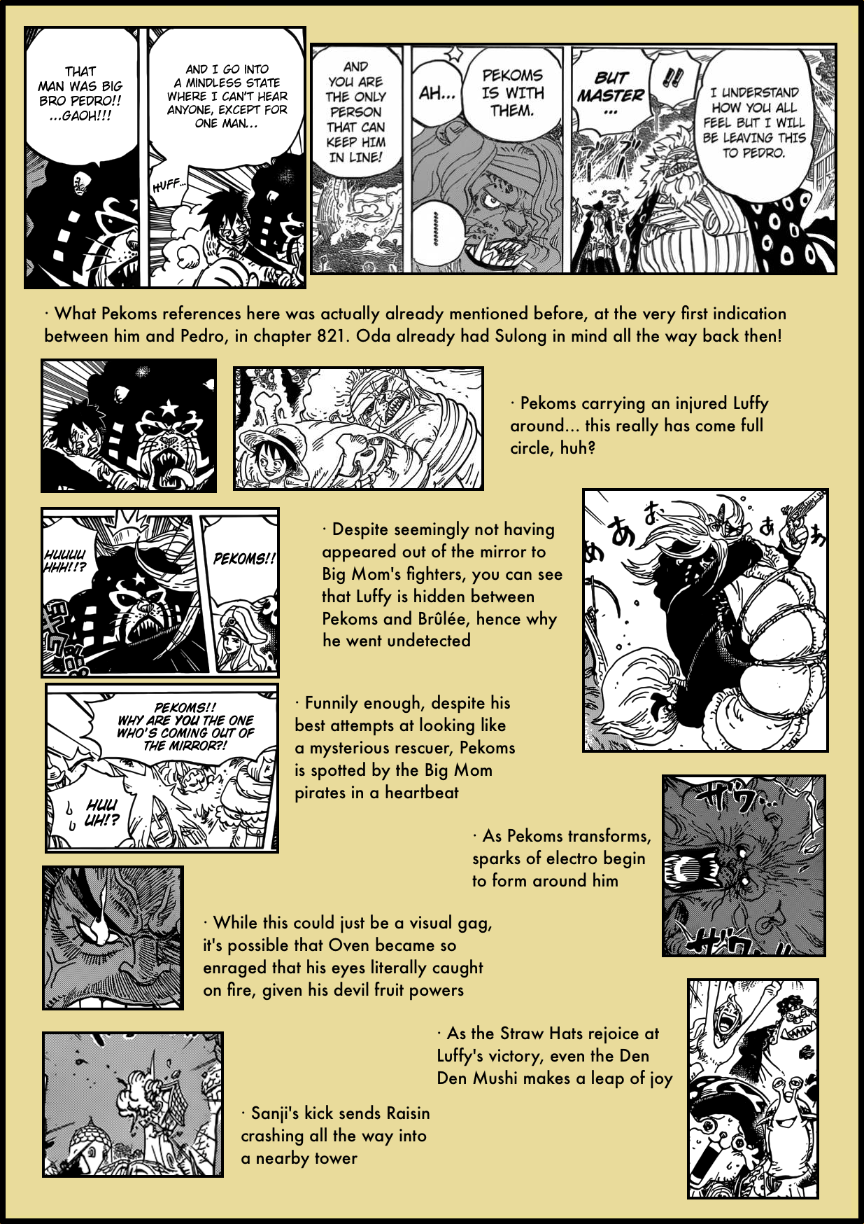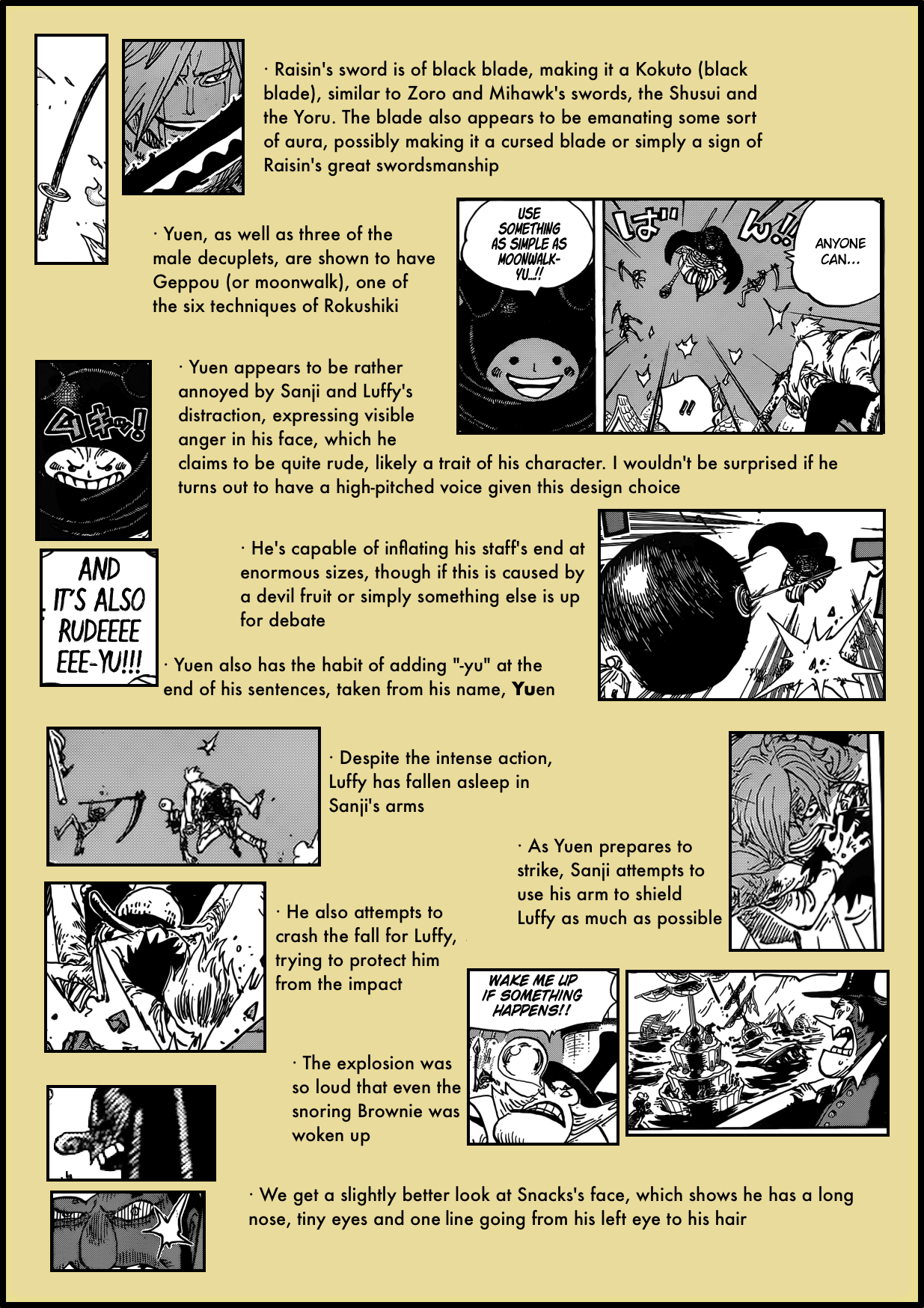 En lo de la espada de Raisin yo creo que no es una black blade, sino que Raisin la recubre con busoshoku haki, ya que está usando la misma onomatopeya “zuzu” misma que se nos mostró cuando Zoro hace lo mismo en Dressrosa al tratar de frenar la jaula de pájaros.