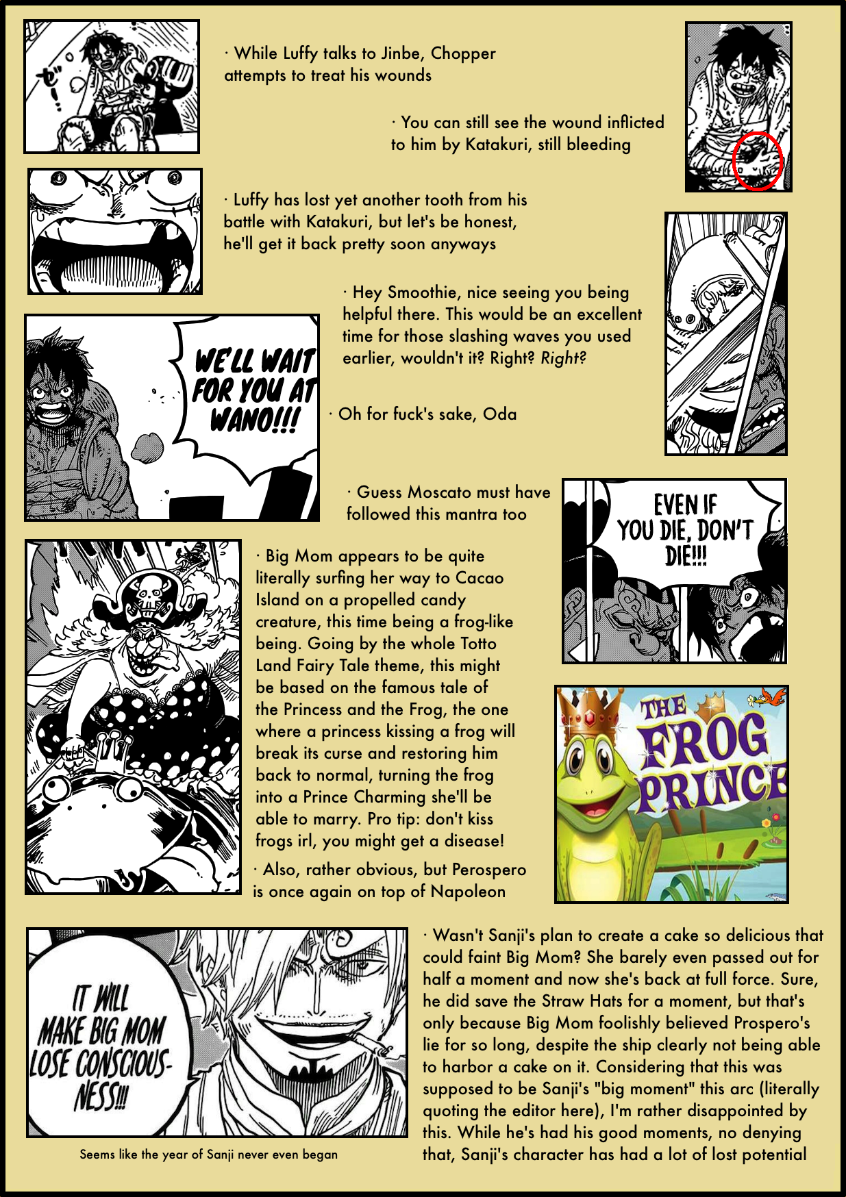 I won’t deny the fact that I was rather disappointed by this chapter. I’m not angry or anything, just disappointed, I think a lot more could have been done here, not to mention some really odd choices Oda took in this chapter. But at the very least, there’s a lot of interesting details here, so let’s go through them one by one!