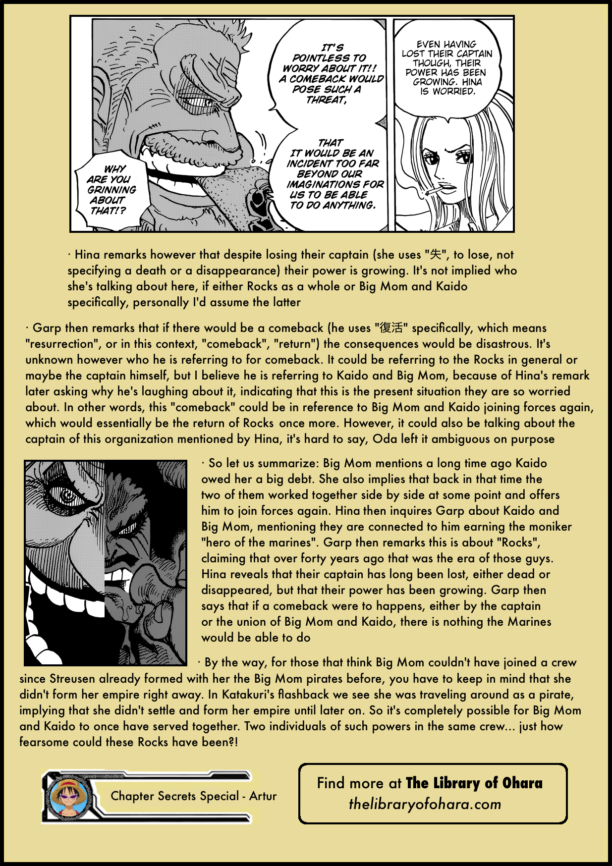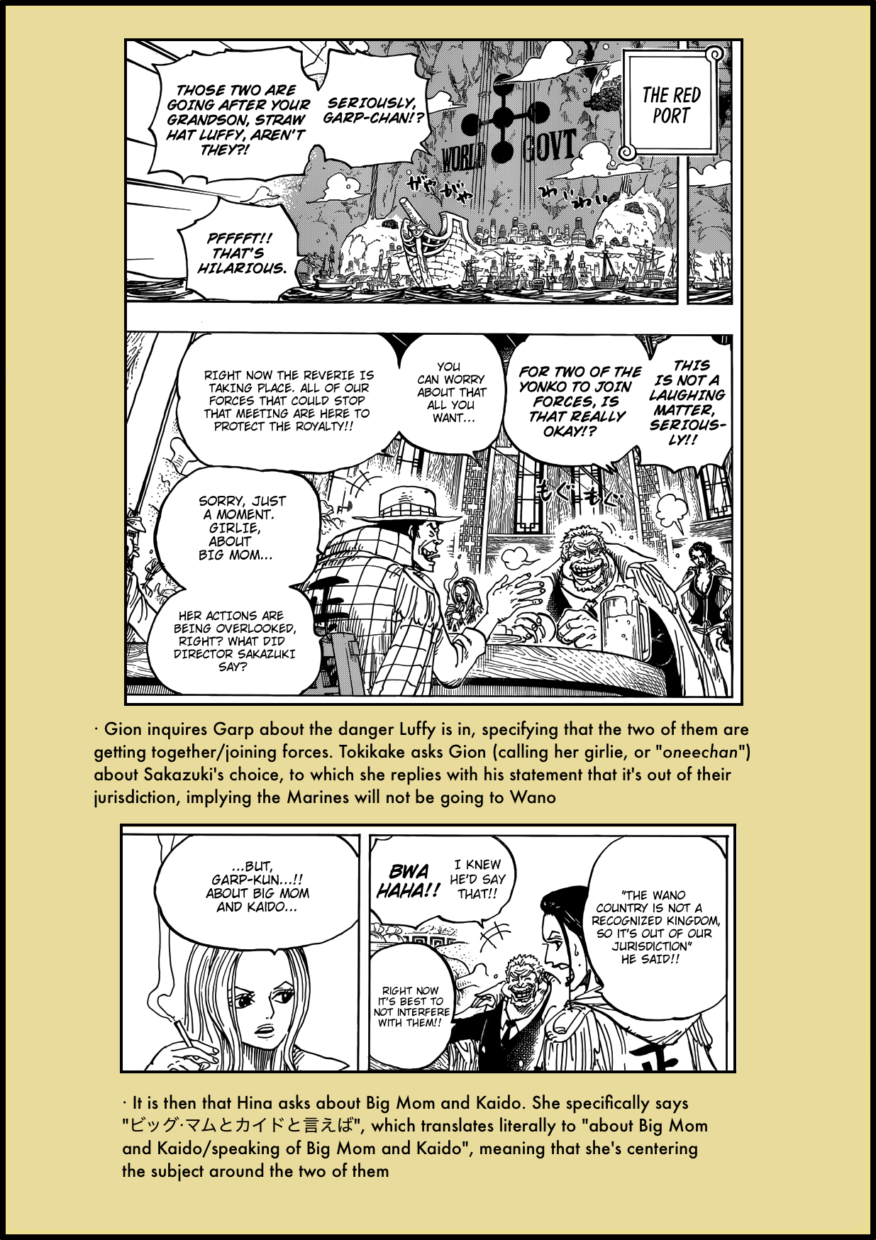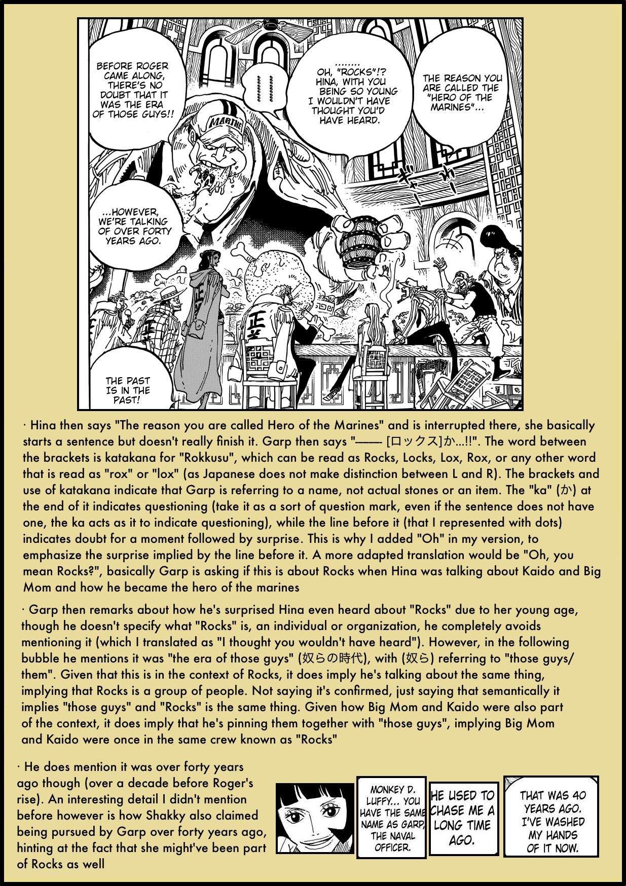 2. I basically agree with everything that you wrote, but it really doesn’t seem Oda’s style to make a reference to something twice in the same chapter, Big mom telling Kaisou to team up (again) and then Garp kinda talking about it, something just feels off.