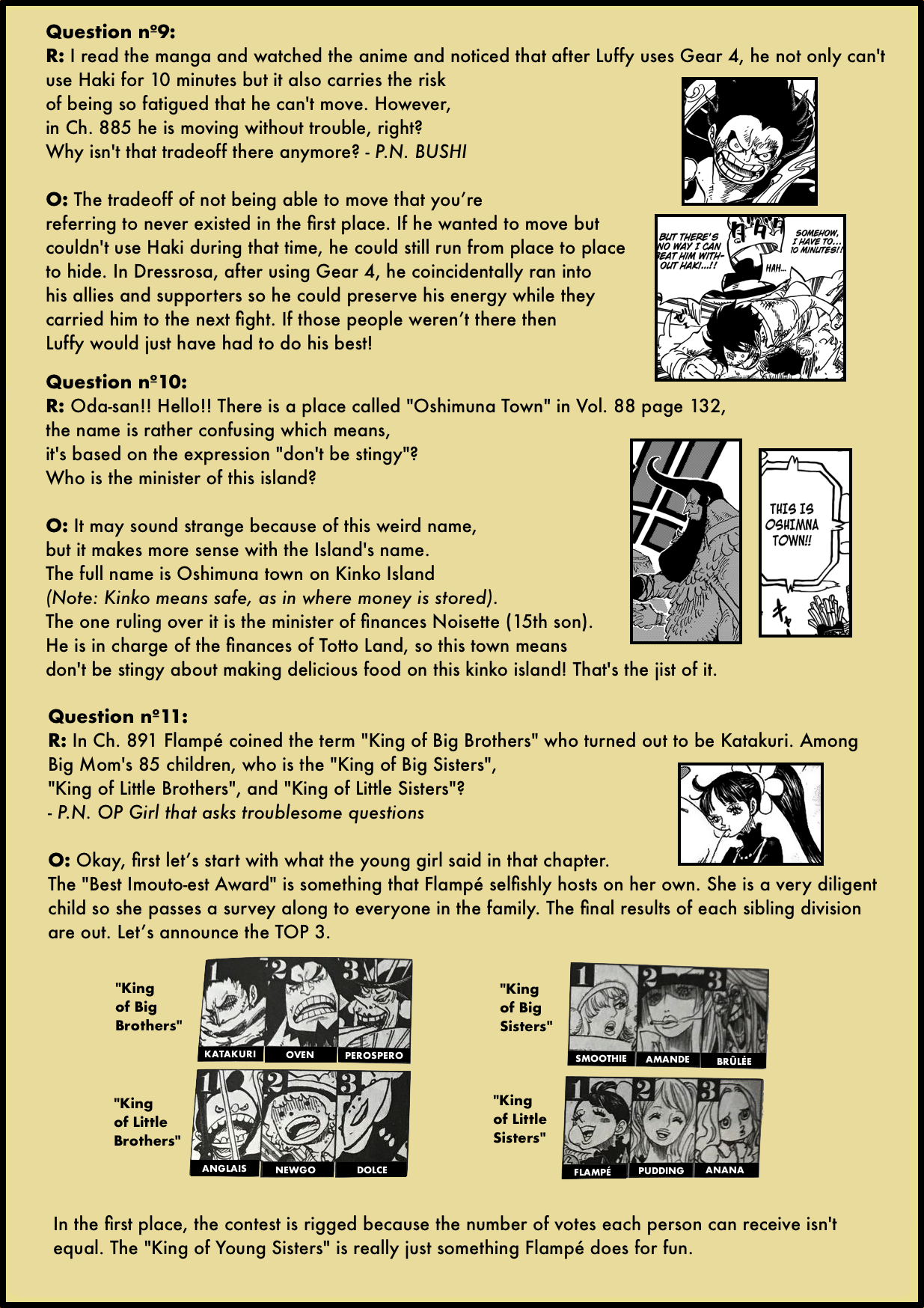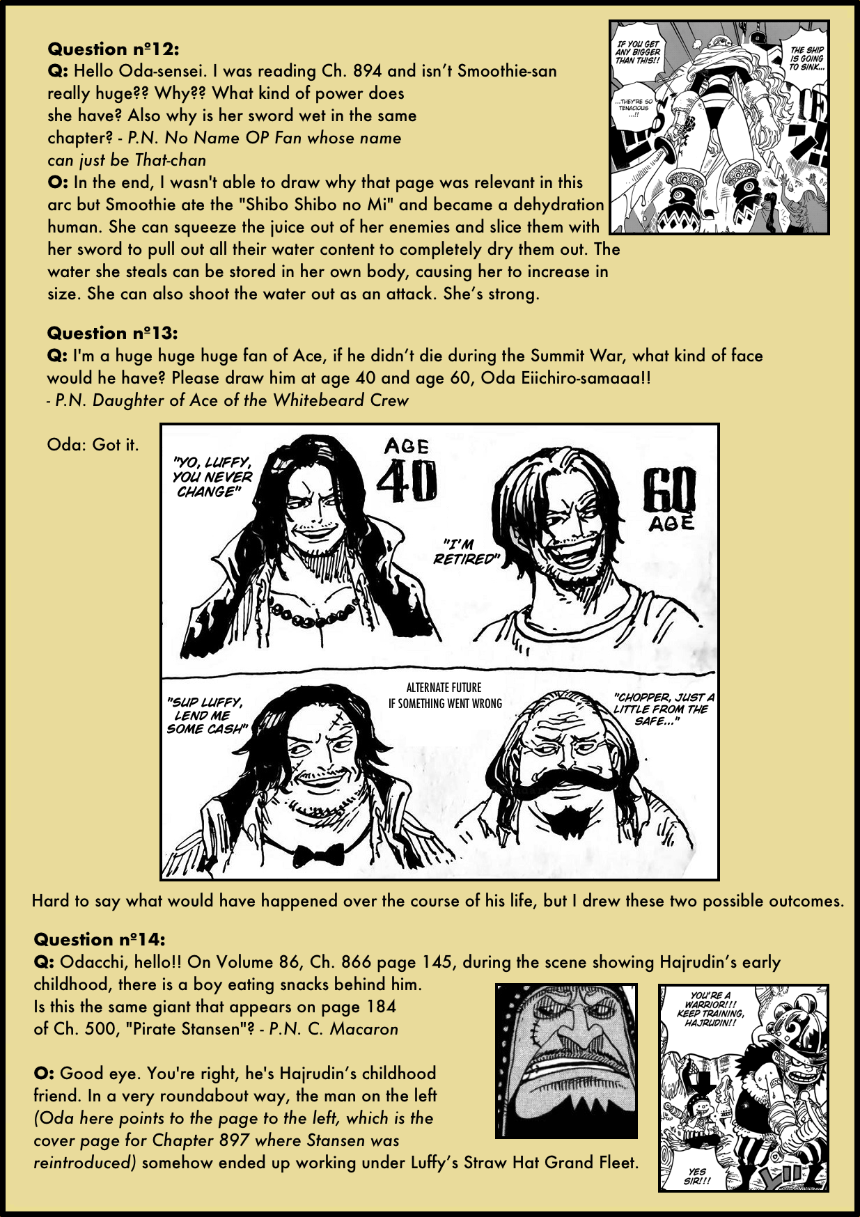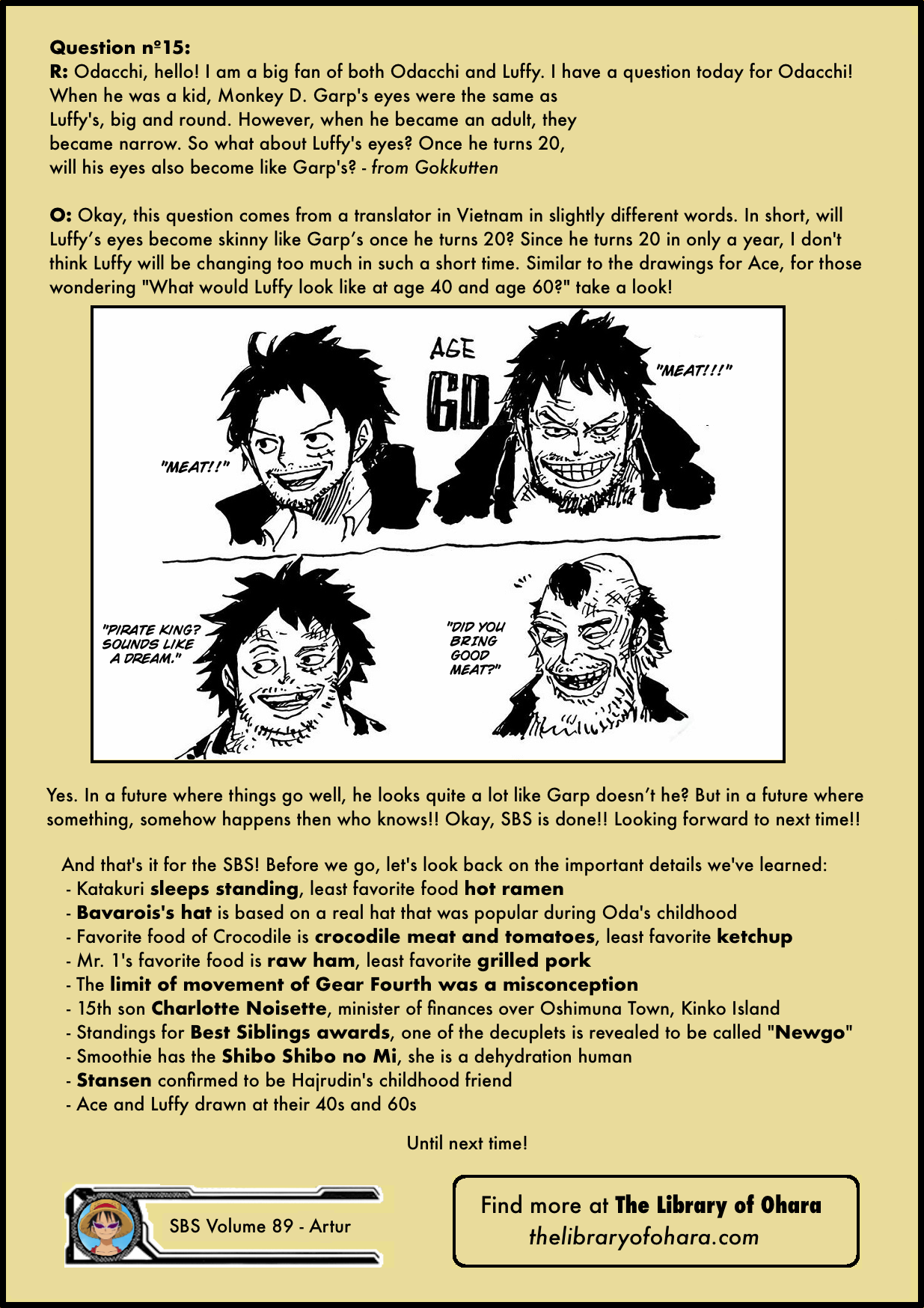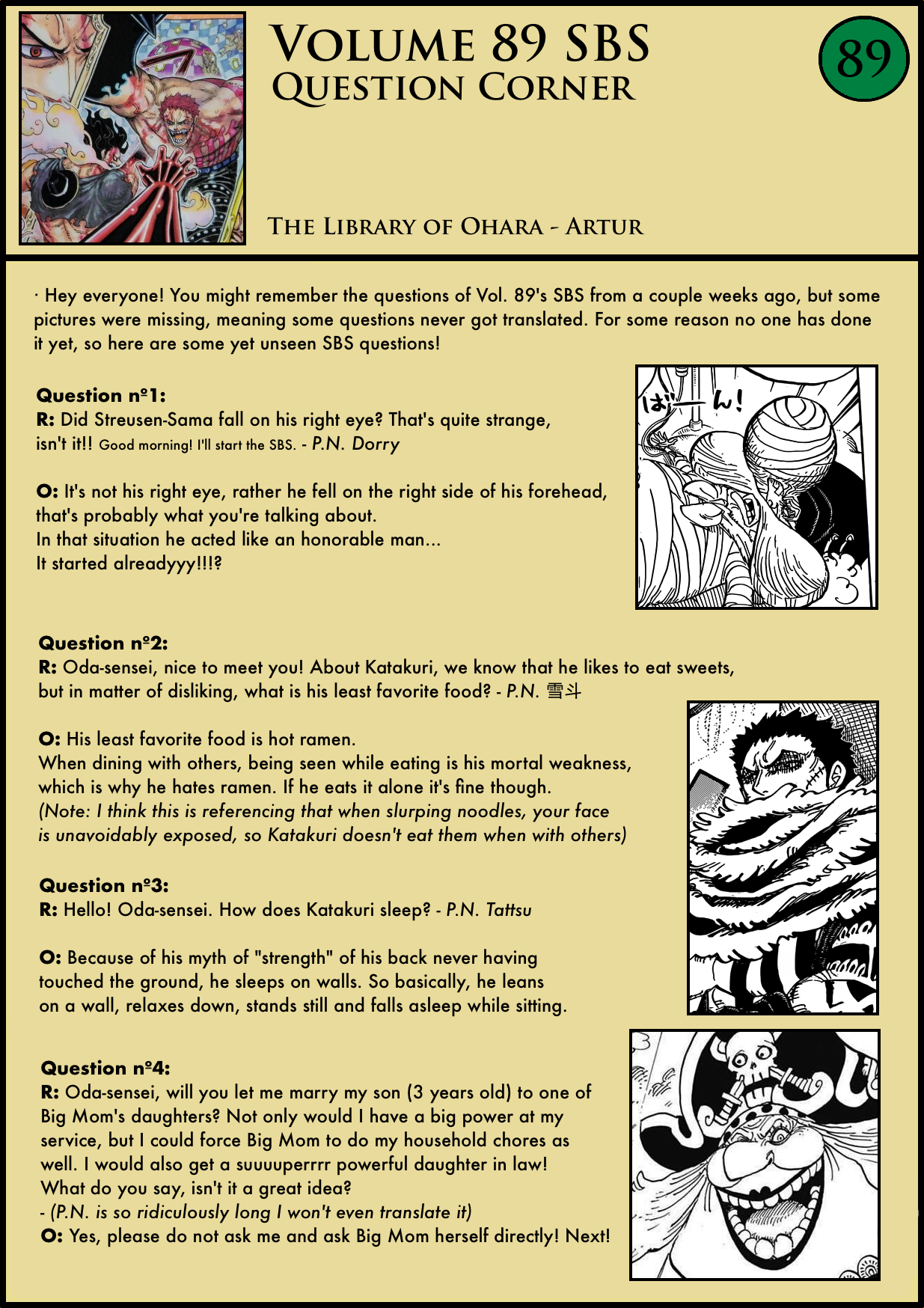 […] En aquesta entrada us parlarem dels SBS volum 89. En algunes edicions dels volums de One Piece, com la japonesa o la francesa, hi ha una secció de preguntes i respostes amb l’autor anomenada SBS, amb la qual Eiichiro Oda respon preguntes dels fans personalment. Quan el volum 89 va sortir al Japó, es van filtrar els SBS a Internet, i la nostra col·laboradora Care124 els ha traduït en col·laboració especial amb el web des de la font The Library of Ohara. […]