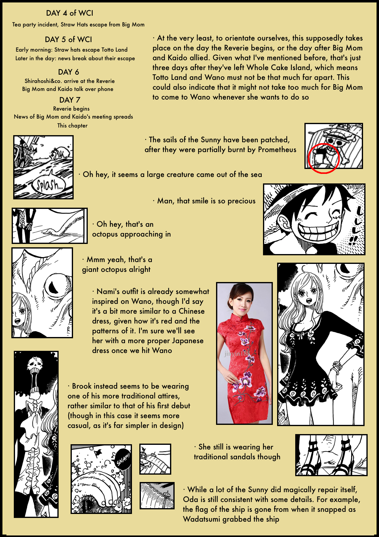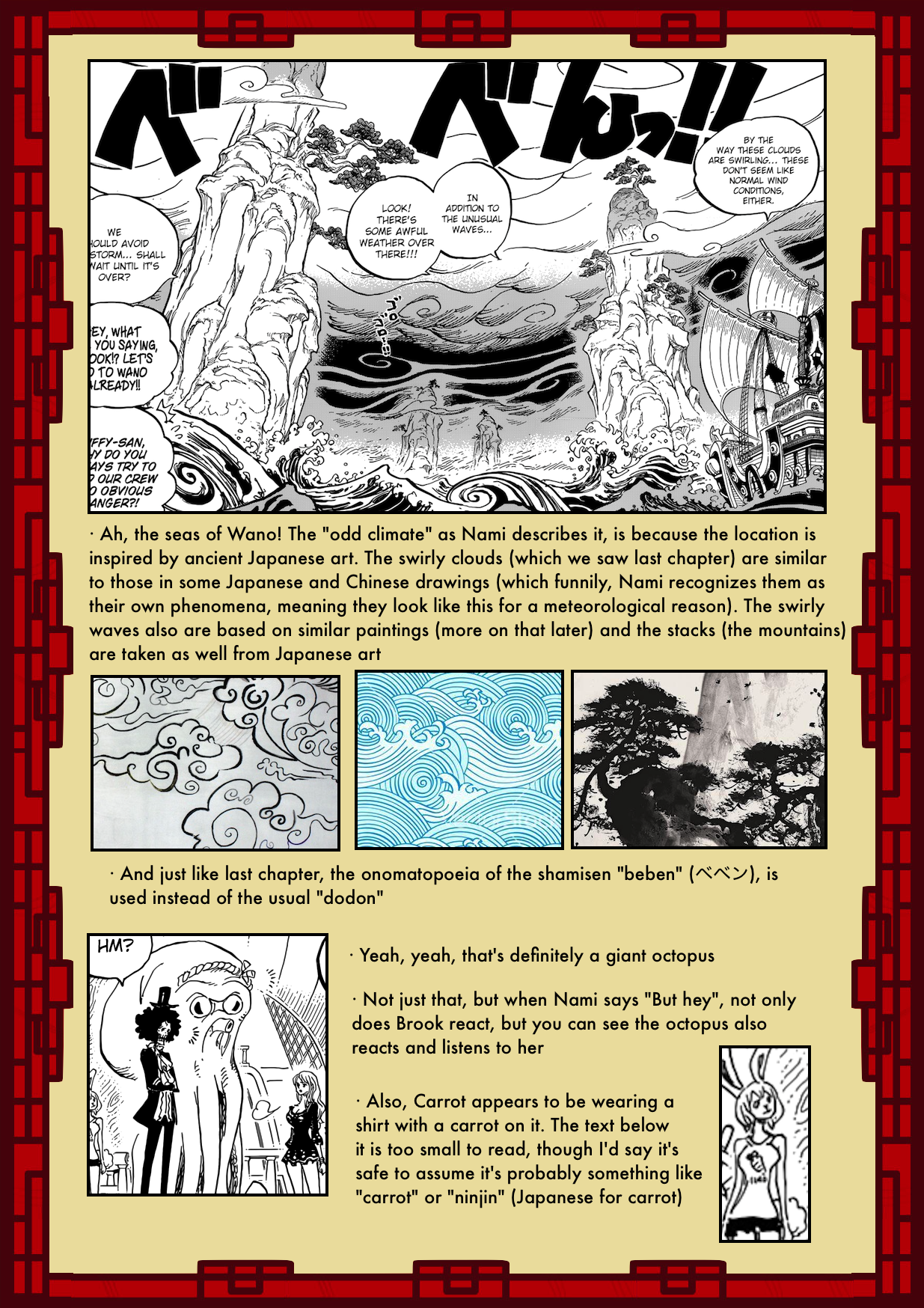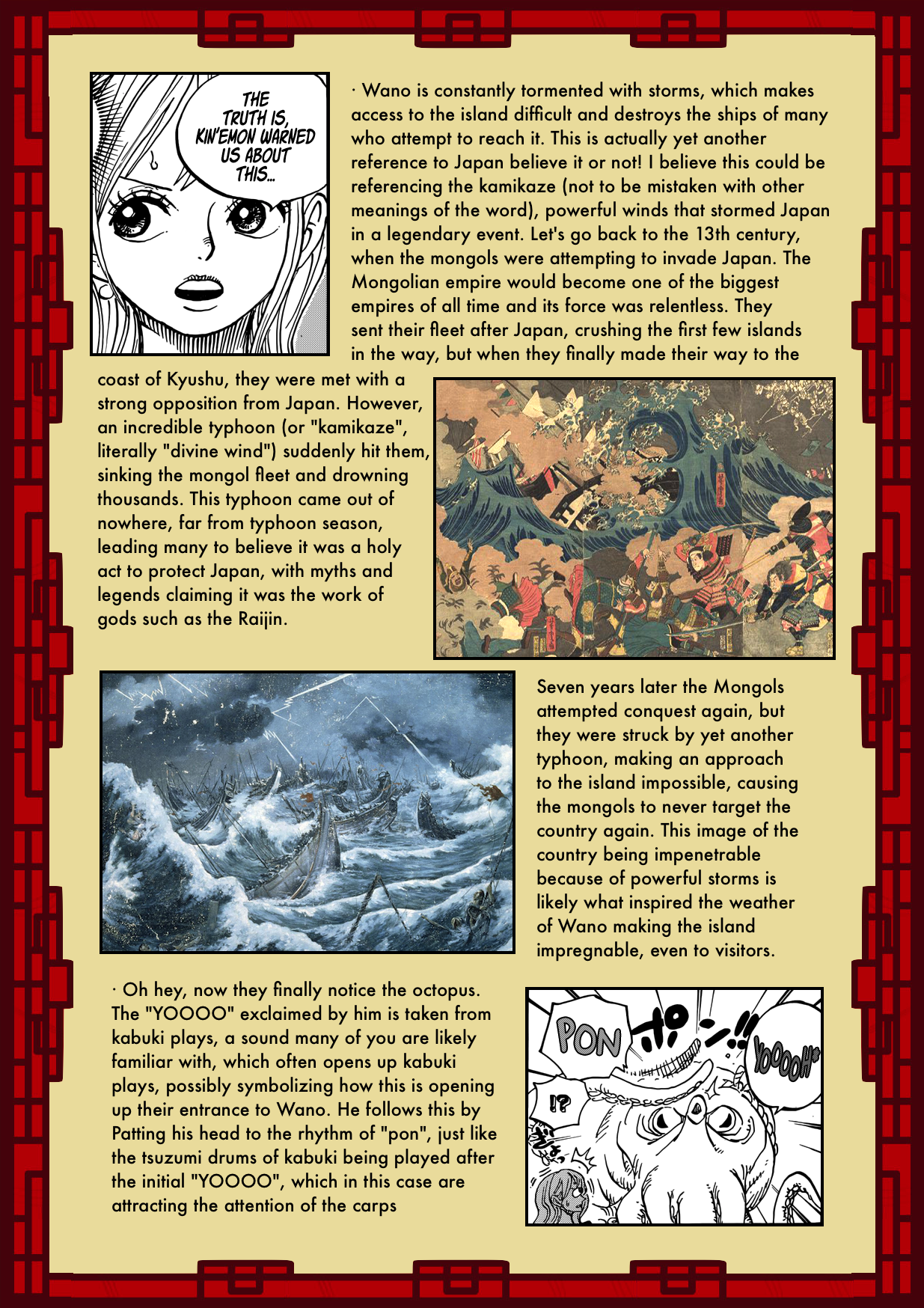 a theory out there, Wano is made up of 4 islands (Spring, Summer, Fall, and Winter) just like Japan has 4 main islands. Zoro is on the Spring island, Luffy is on the Summer island, Law is on the Fall island, and Kaido is on the Winter island. Any thoughts?