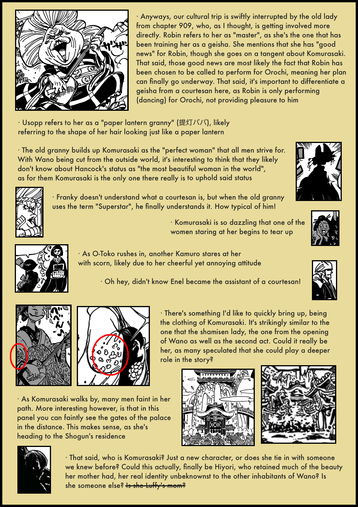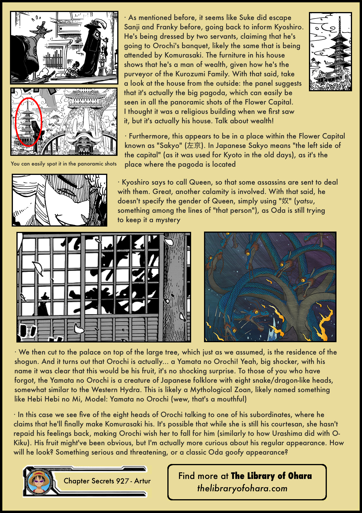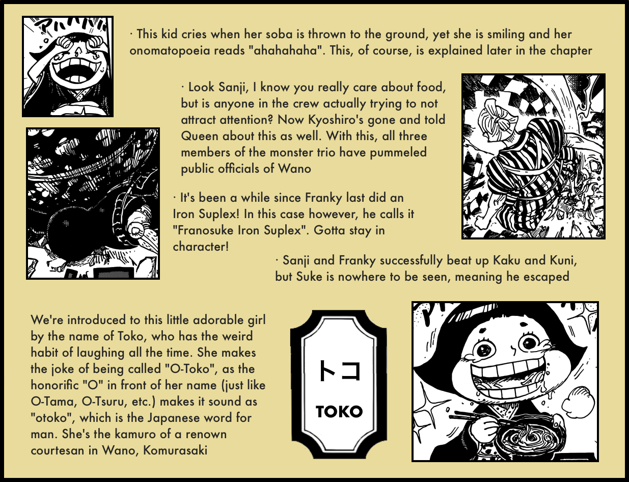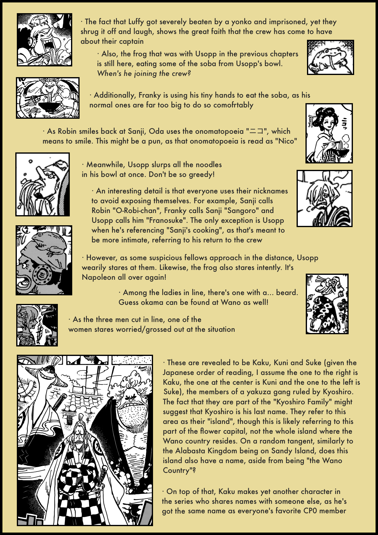 1. Awesome work and thourough analysis Artur-dono; i must say that kyoshiro’s previous comment still bugs me, as he insinuated that orochi is a coward; was it intended to be taken in the literal sense or just a figure of speech; also maybe the sneaky/weaselly craftiness comes as a characteristic of the devil fruit he consumed, i mean him being an orochi and all.