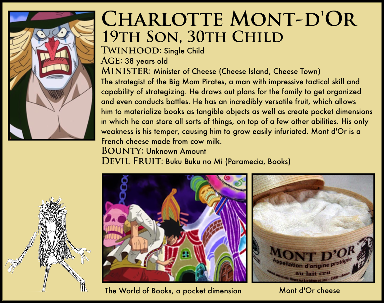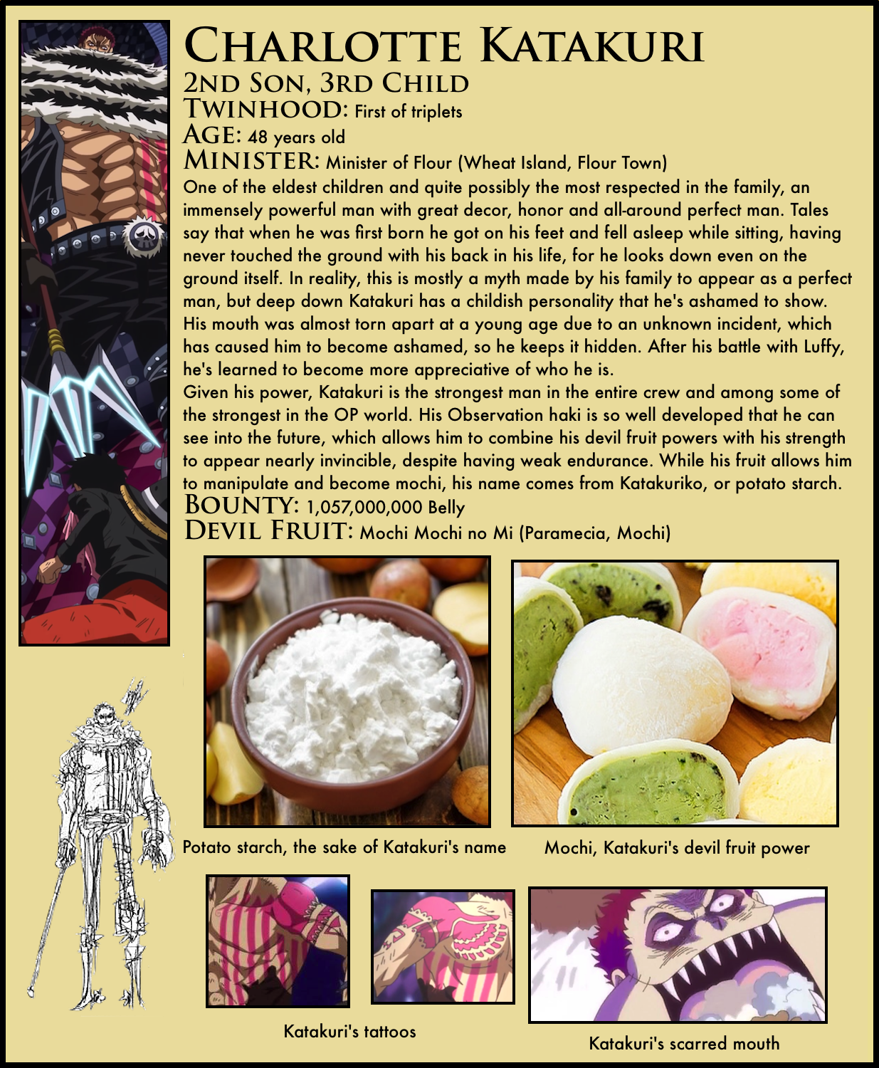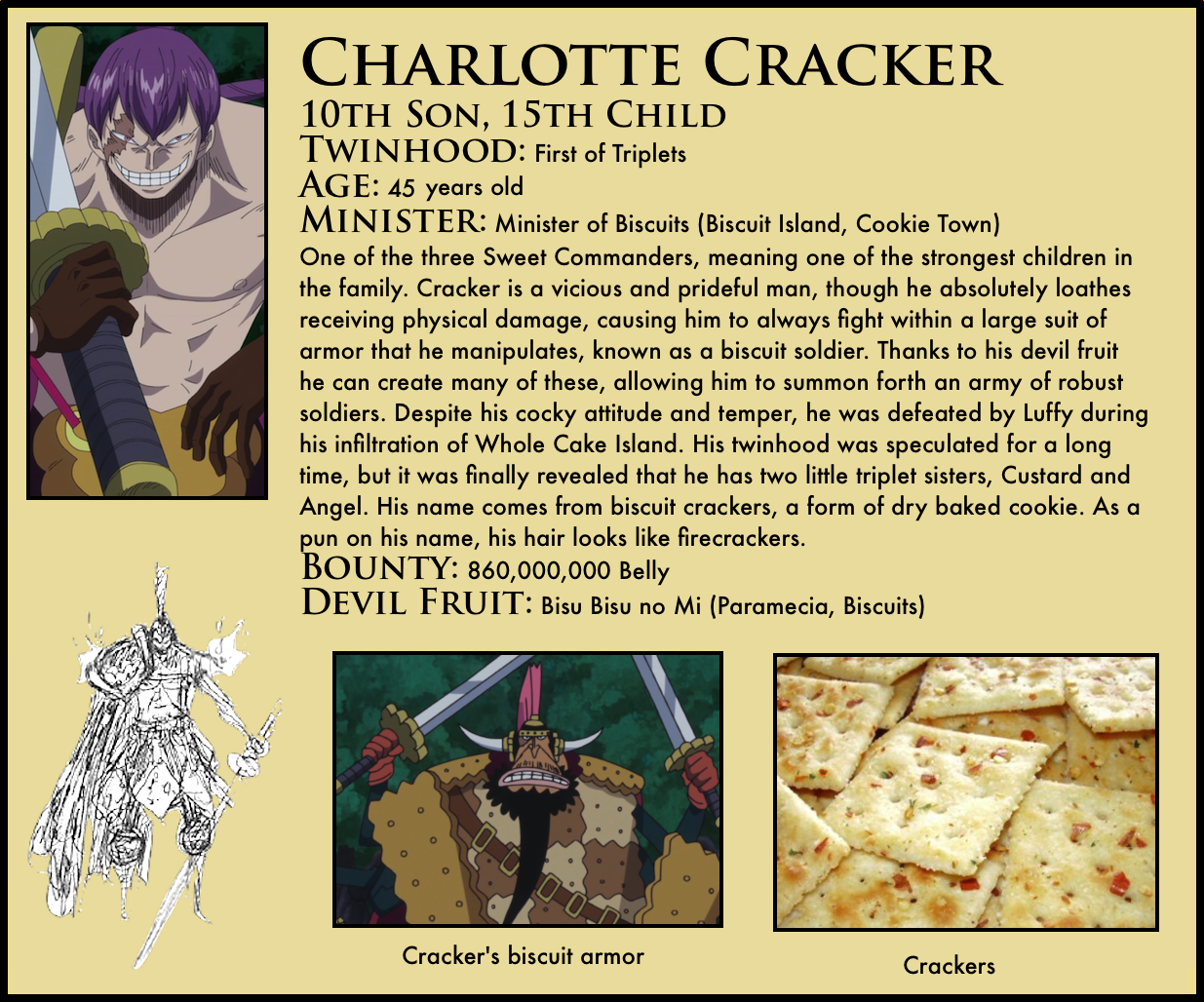 • I don’t think he was making an assumption, this is all based on the info from the supplemental material, obviously he was an absolute tank haha. It’s cracker that usually gets sandbagged by fans for being one-shot, even though luffys attack would have KOd most everyone but top tiers, & his power is super useful and effective, especially if you can’t weaken it and don’t know the true body