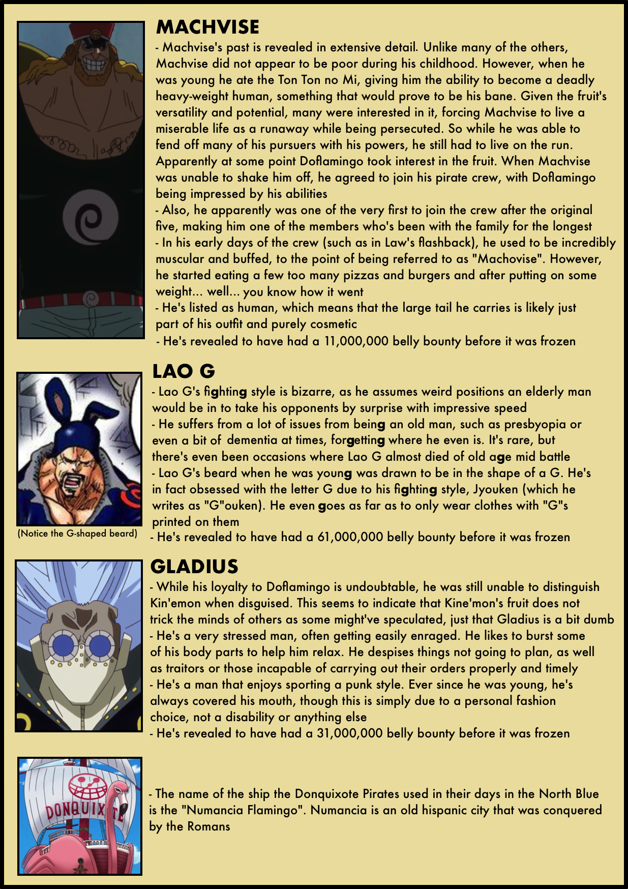 In this month’s Vivre Card packs we get an extensive amount of info on every member of the Donquixote Family as well as… Foxy’s full untold backstory?!