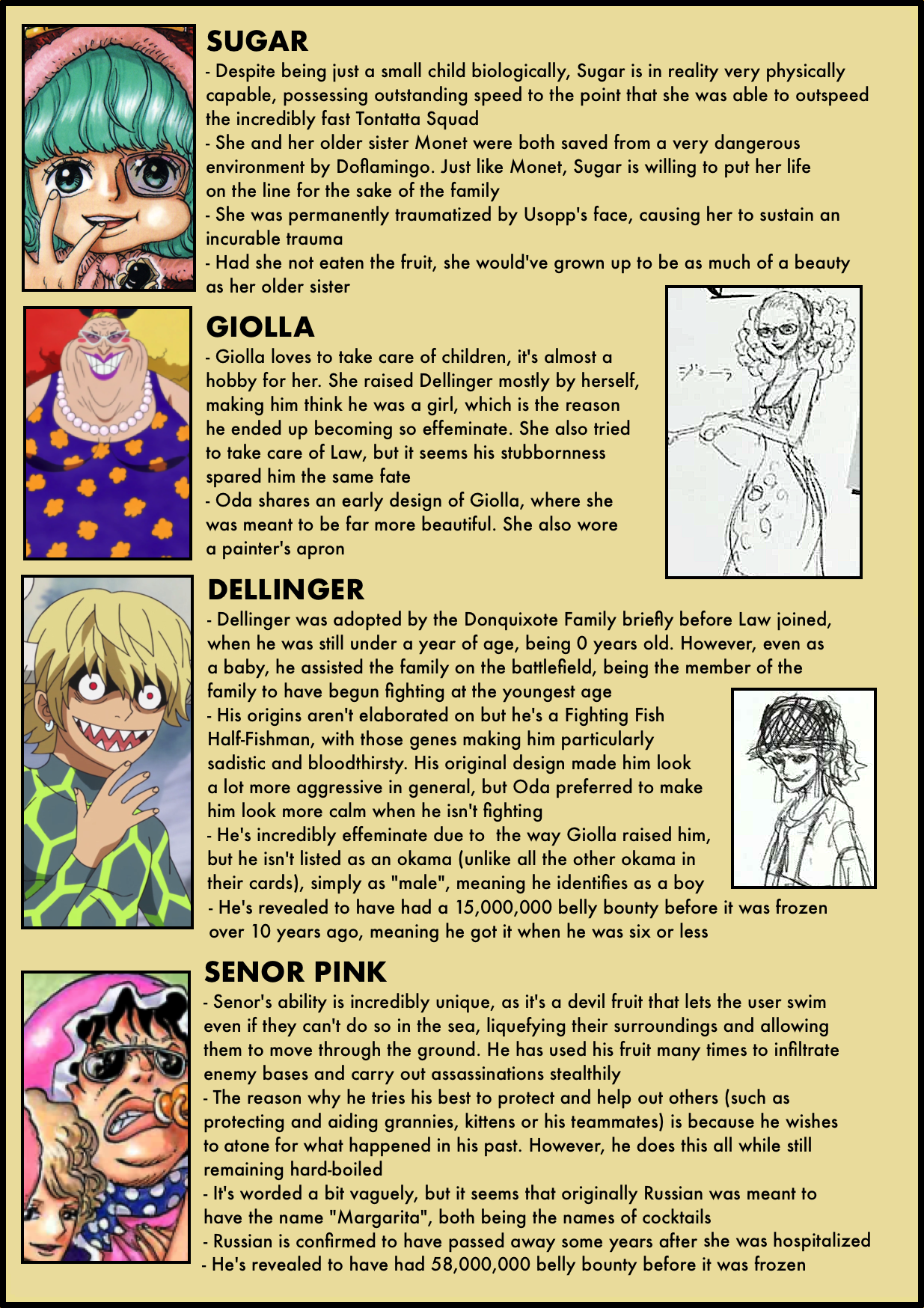 Based on Giolla’s beta design and her “motherly” tendencies, my theory is that she once had a child before but lost it somewhere in her travels with the Donquixote pirates (whether due to fully embracing the pirate life or by her lover wanting to keep the child from a criminal). This would later hit her hard and she would impart that to the youngest of the crew. Assuming she was a part of the DQ pirates before Dellinger came around (him being 16 post timeskip), and assuming her current age is 71 (based on the wiki, I forgot where Oda revealed her age in), she would have been 43-45 around that time (45 was the earliest we saw her being a part of the DQ family). She being an artist both now and in her child age (Oda’s depiction of her anyway), I would like to assume her child would also be an artist; which comes to my hypothesis that her child, and the only other artist we know of who is around 16-18 years old is…