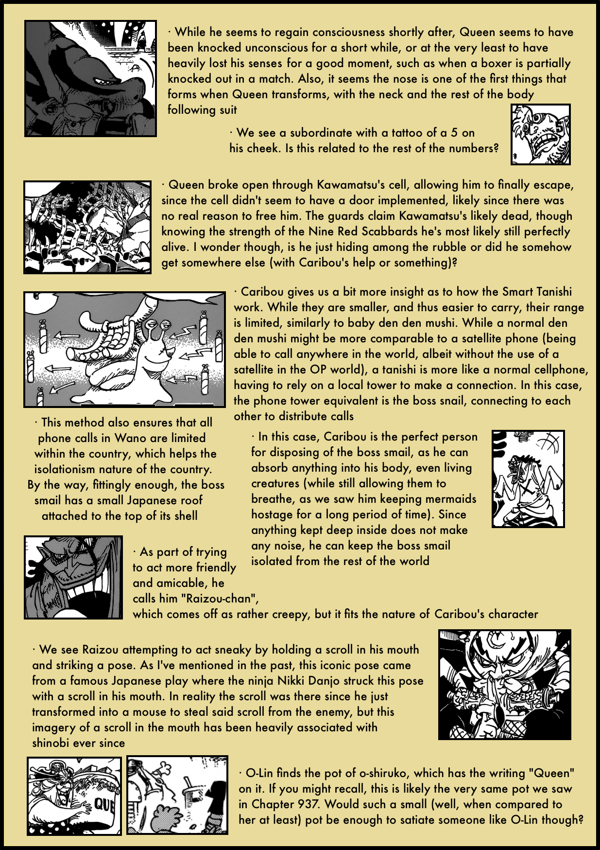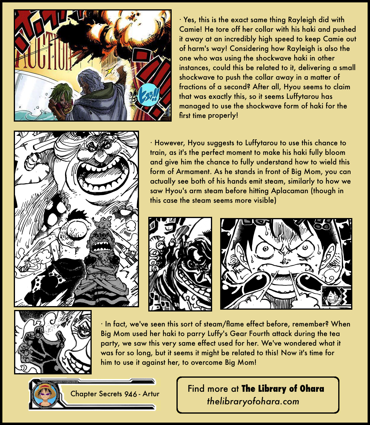 Don’t you think both Big Mom and Kaido are always surrounded by Haki, like they are using Rayleigh’s move with their whole bodies at all times? That would explain why Kaido can’t kill himself and why Big Mom can only be hurt when she has a mental breakdown (remember Brook’s sword couldn’t touch her skin). That’s probably why Luffy needs to learn Rayleigh’s move: you can only pierce through haki by concentrating haki in one point.