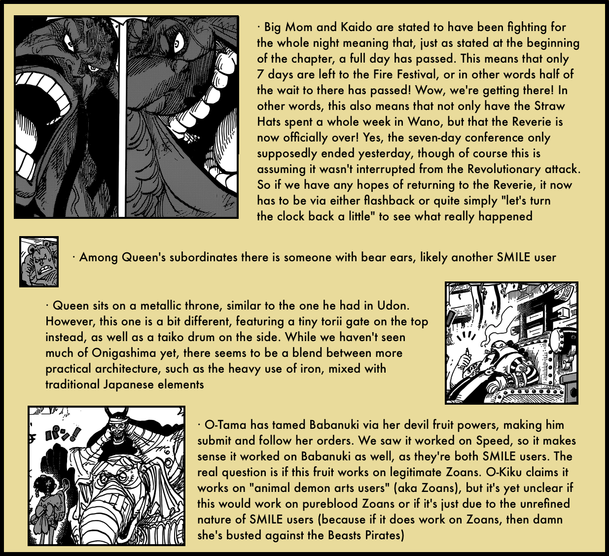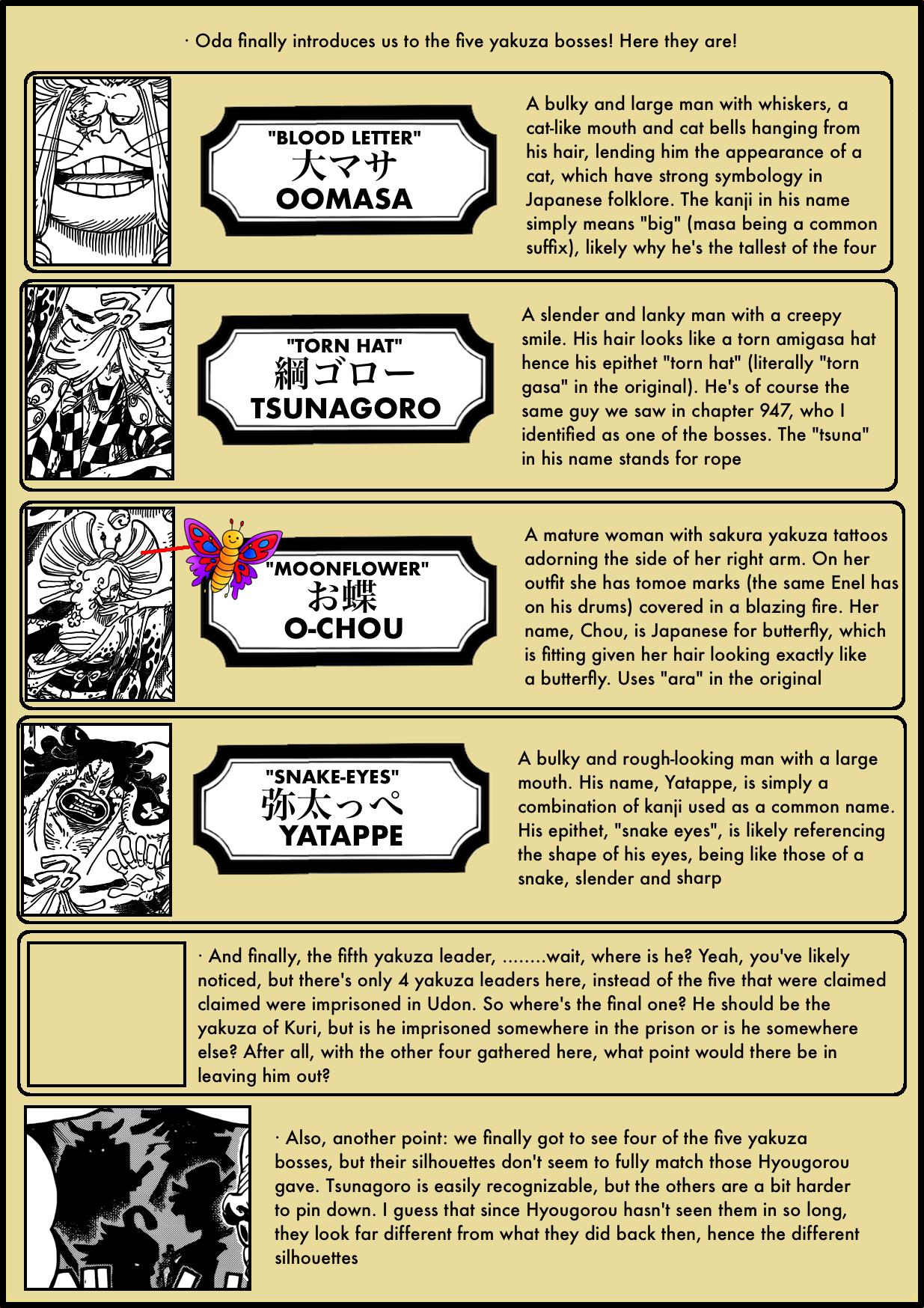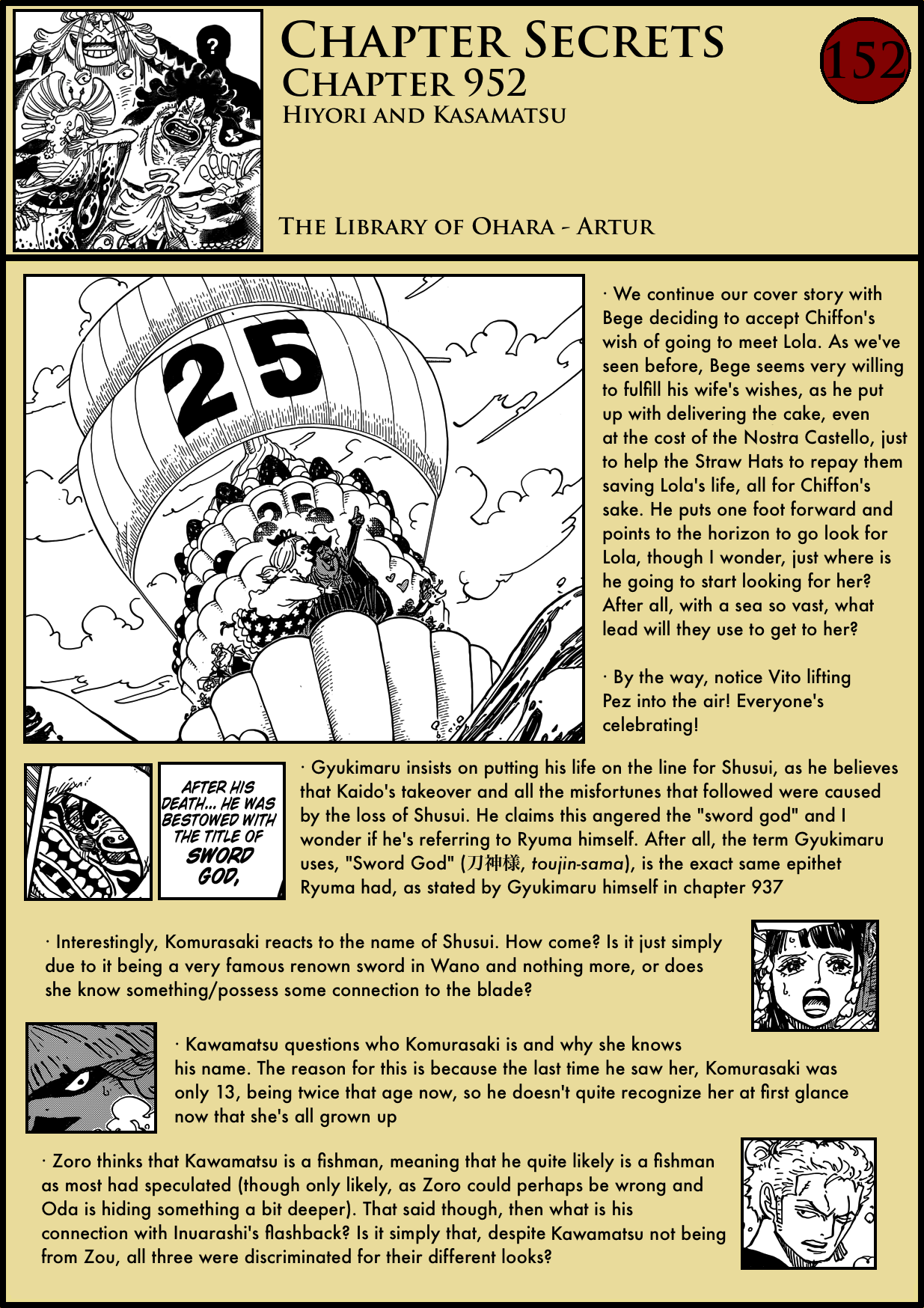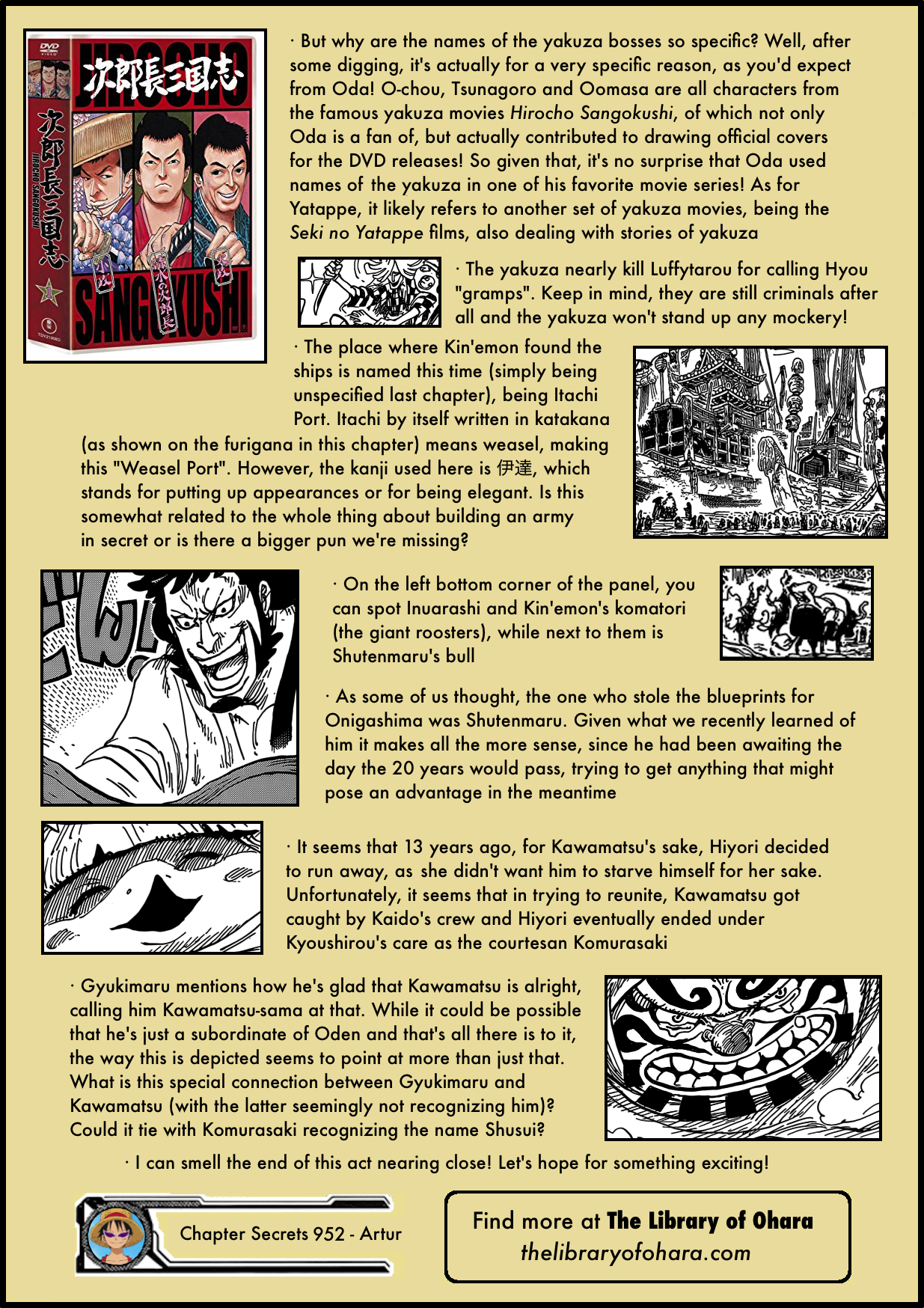 2. Thanks Artur for your website. I enjoy reading it weekly. I need to comment here because the fifth Yakuza leader of Kuri was spelled out in previous chapters and I’m not sure whether you missed it or whether or not. The fifth is none other than Grandpa Hyougorou. Also, I thought you would comment more about how Kawamatsu threw his sword at Zoro and got it deflated back.