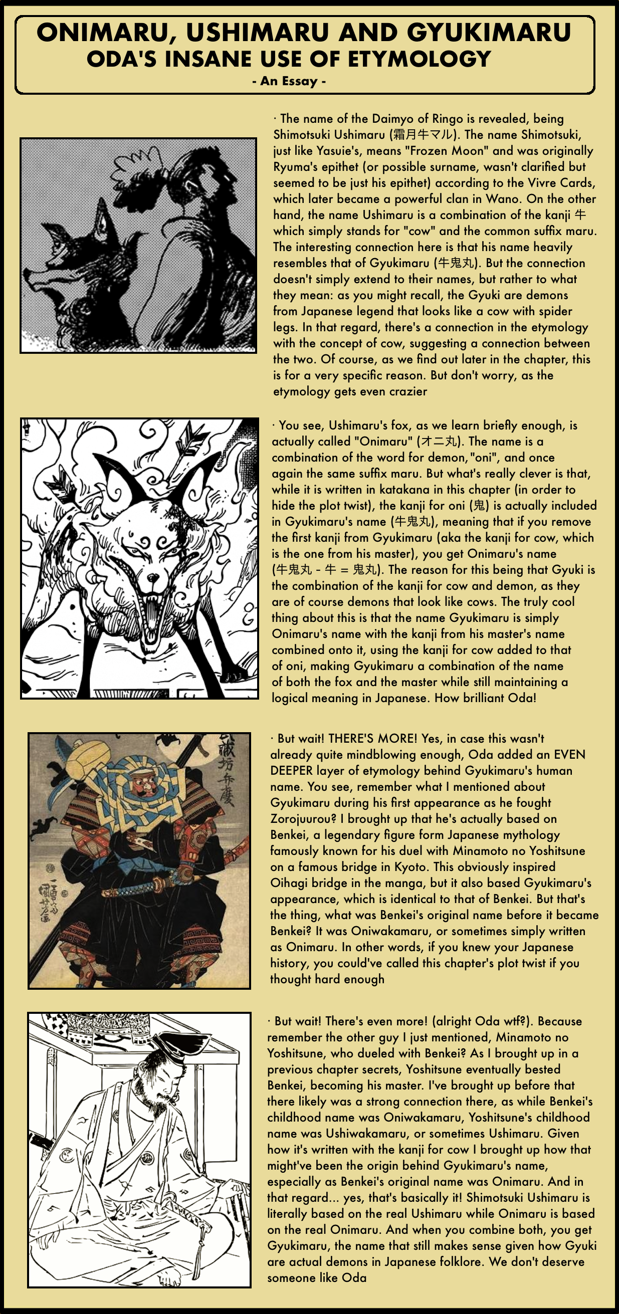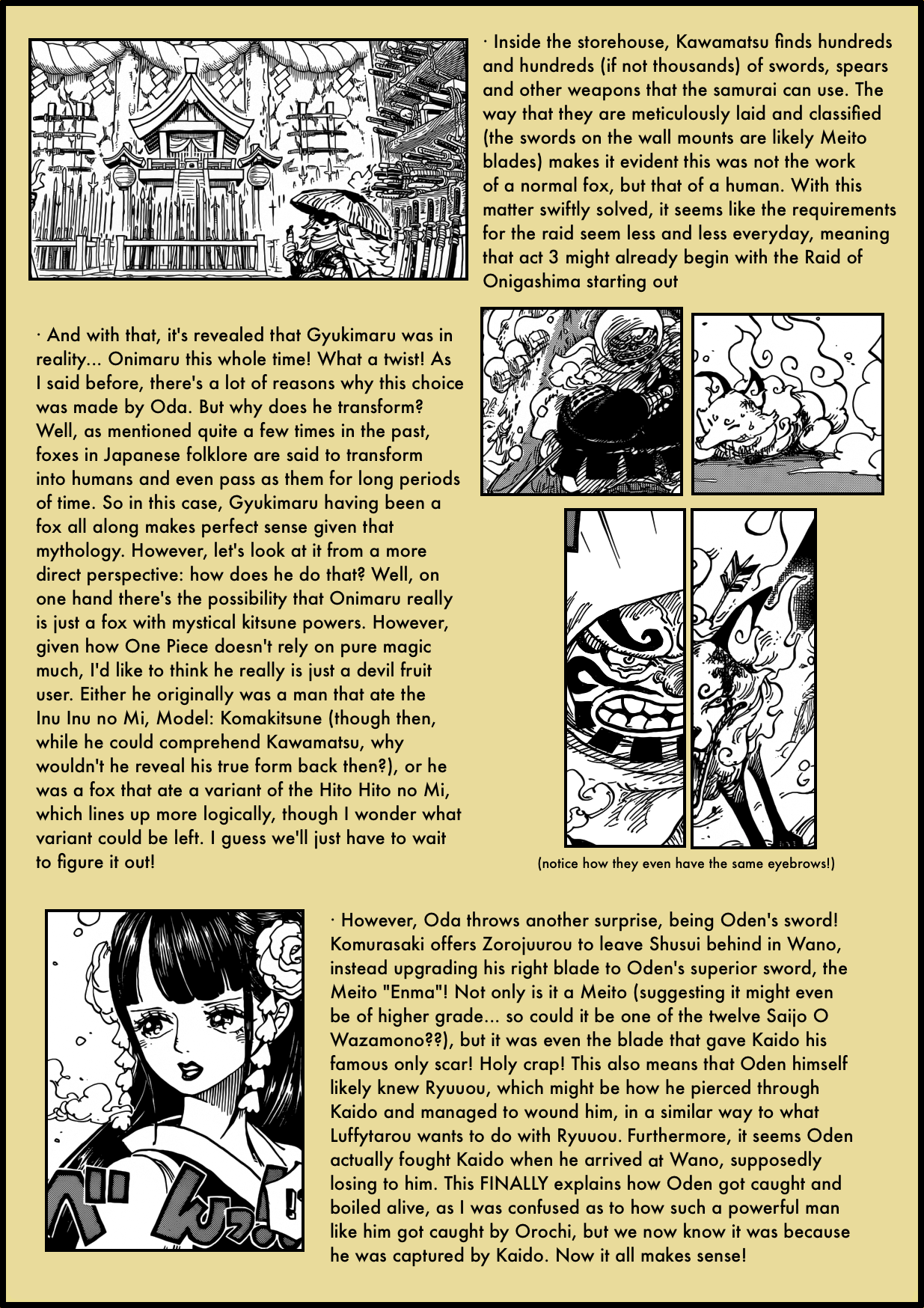 I always read your analysis as soon as I read the new chapter. with your knowledge of past chapters and Japanese cultures and histories, this makes me more respect toward Oda. he’s indeed the best mangaka 😀
