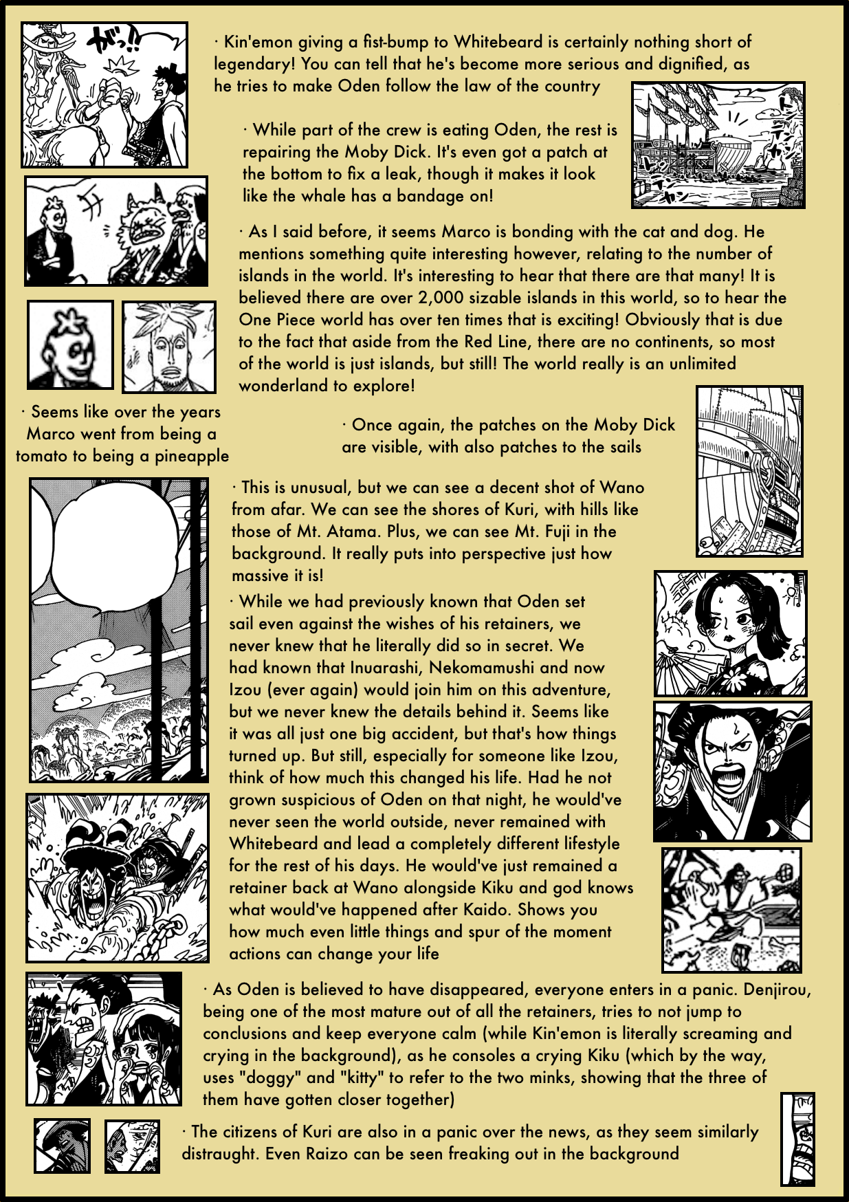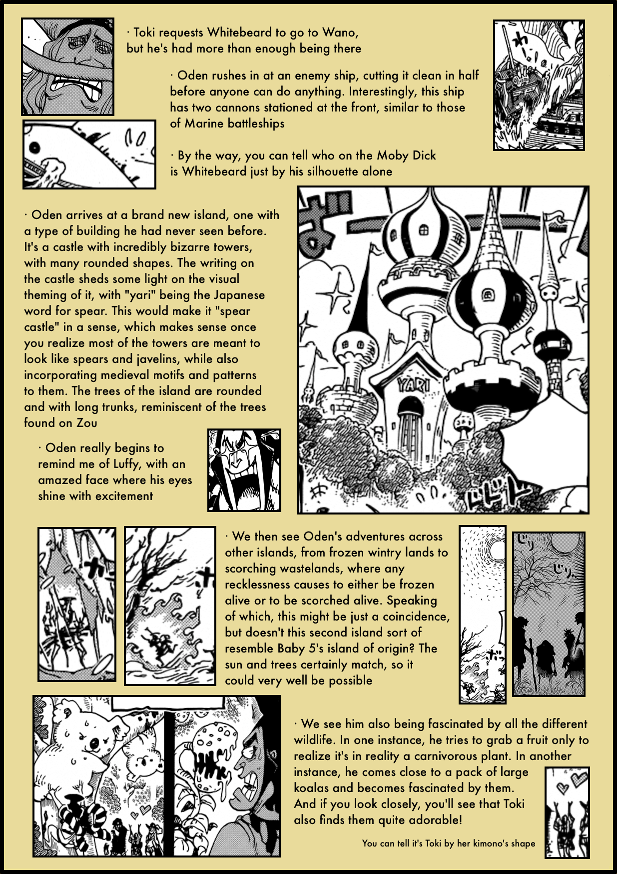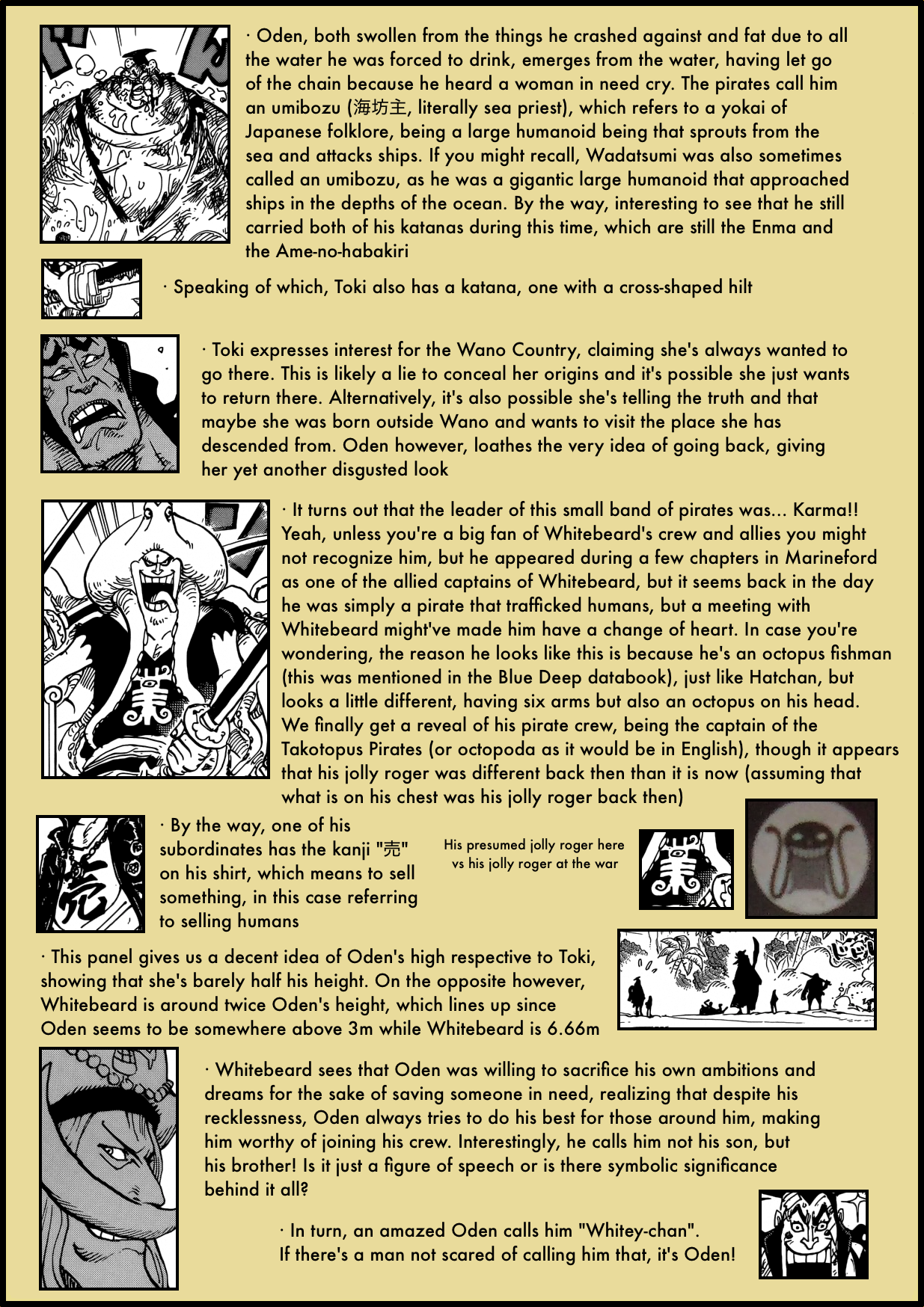 BTW, I’m happy to see I’m not the only one who thought of Luffy when seeing Oden’s child-like wonder to the world he gets to discover. His recklessness getting him into trouble is similar to Luffy too