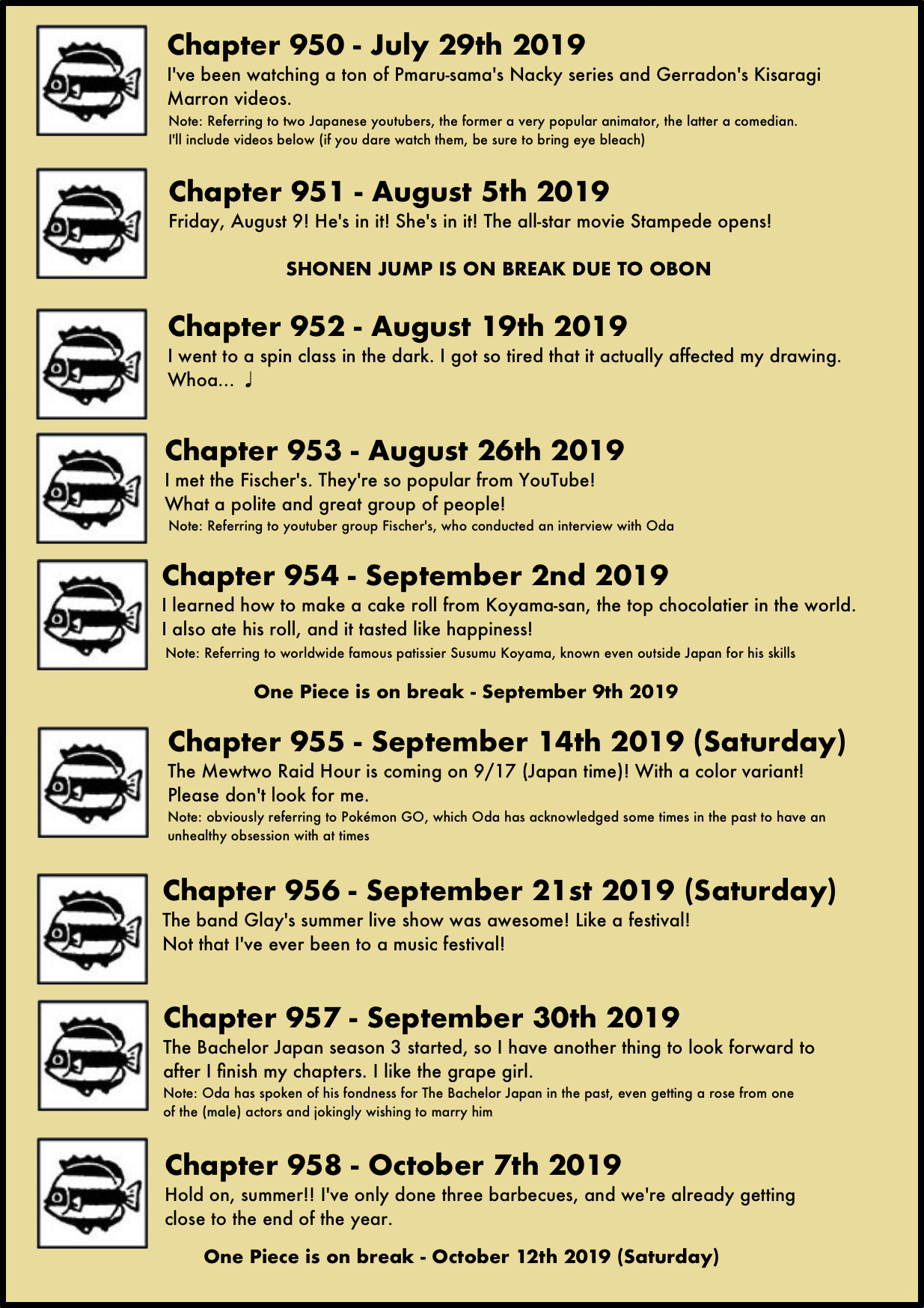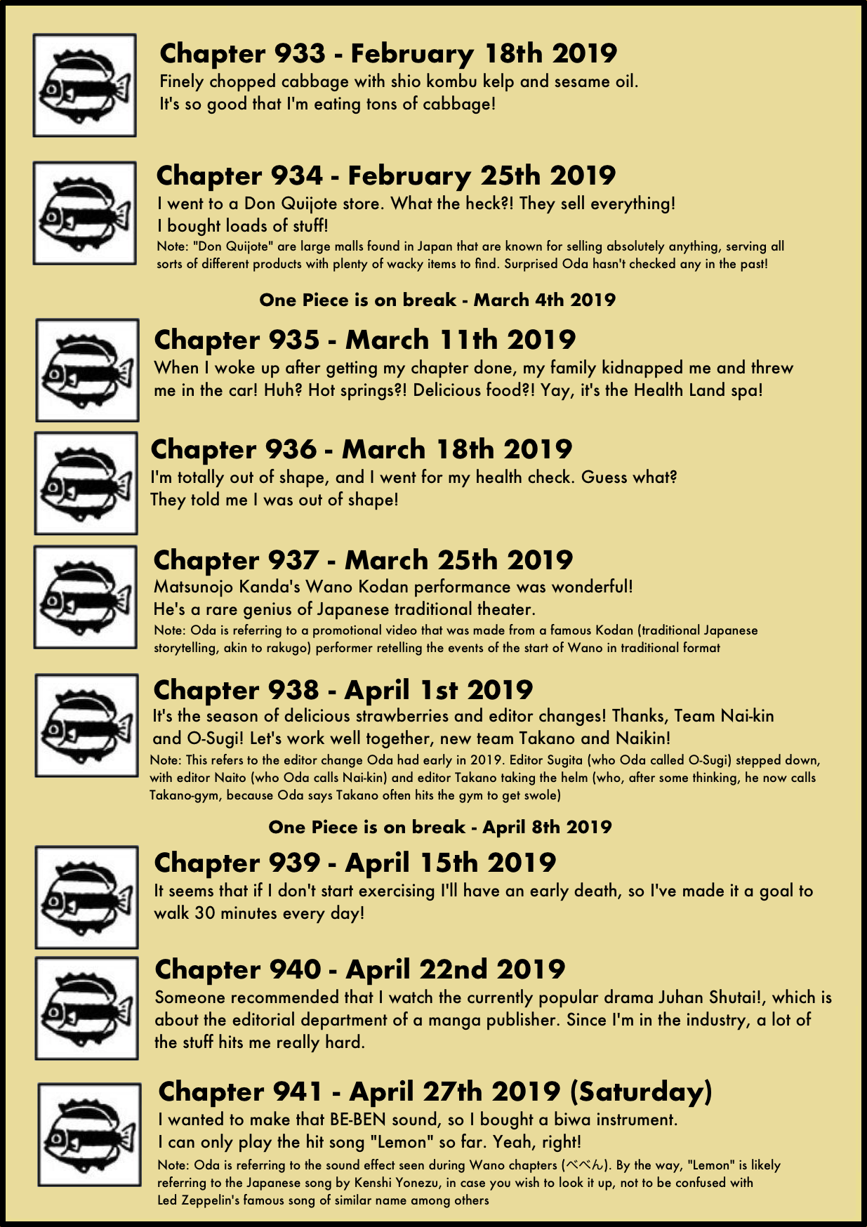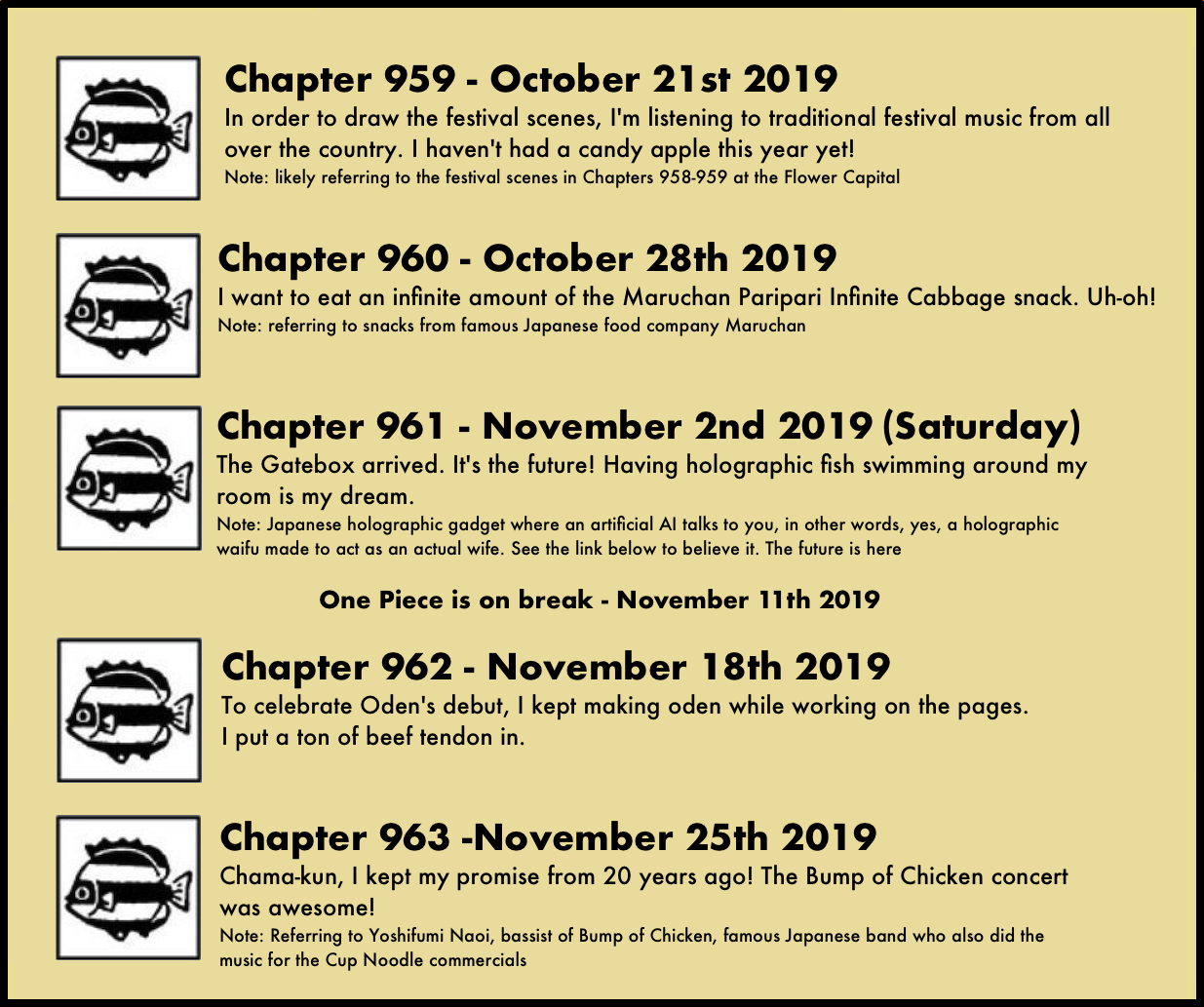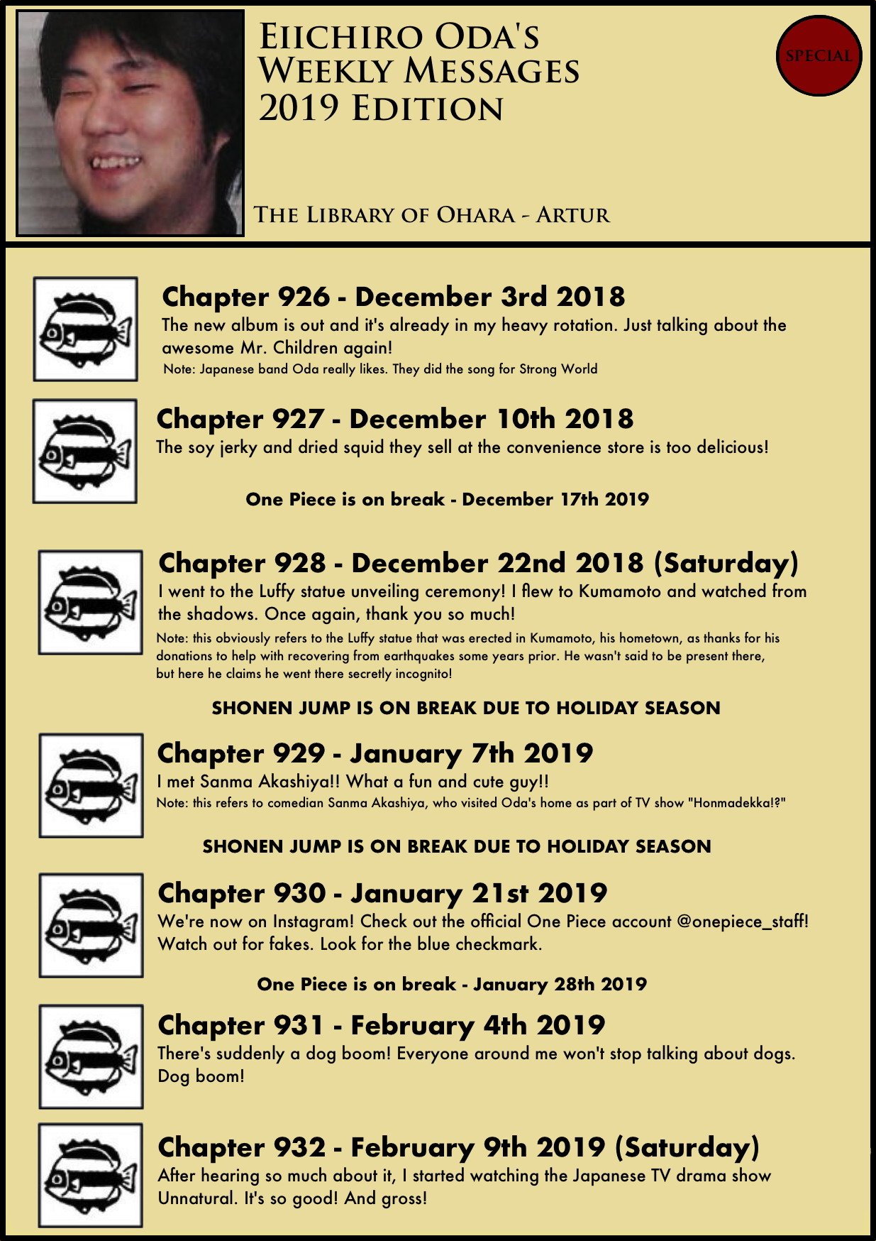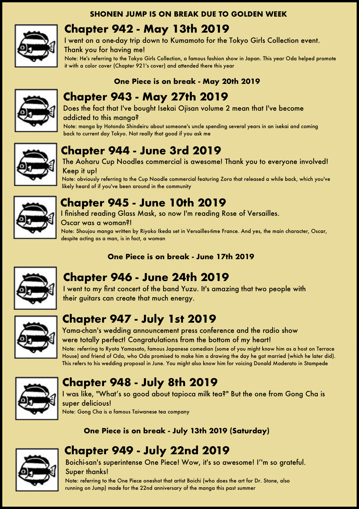 It’s that time again! (and I’m a bit late whoops…). While some of you might not be familiar, every week that Shonen Jump comes out, each manga author includes a small message about their current life in the issue. Oda is no different, so here are all of his comments across 2019, helping bring an insight into his life!