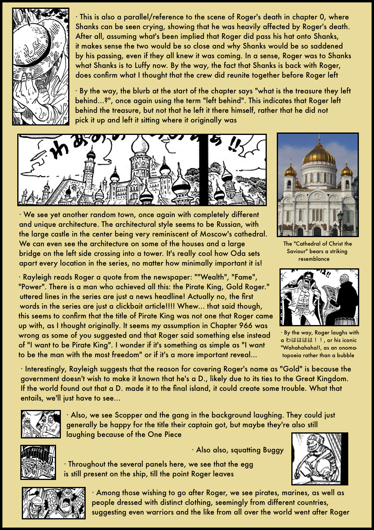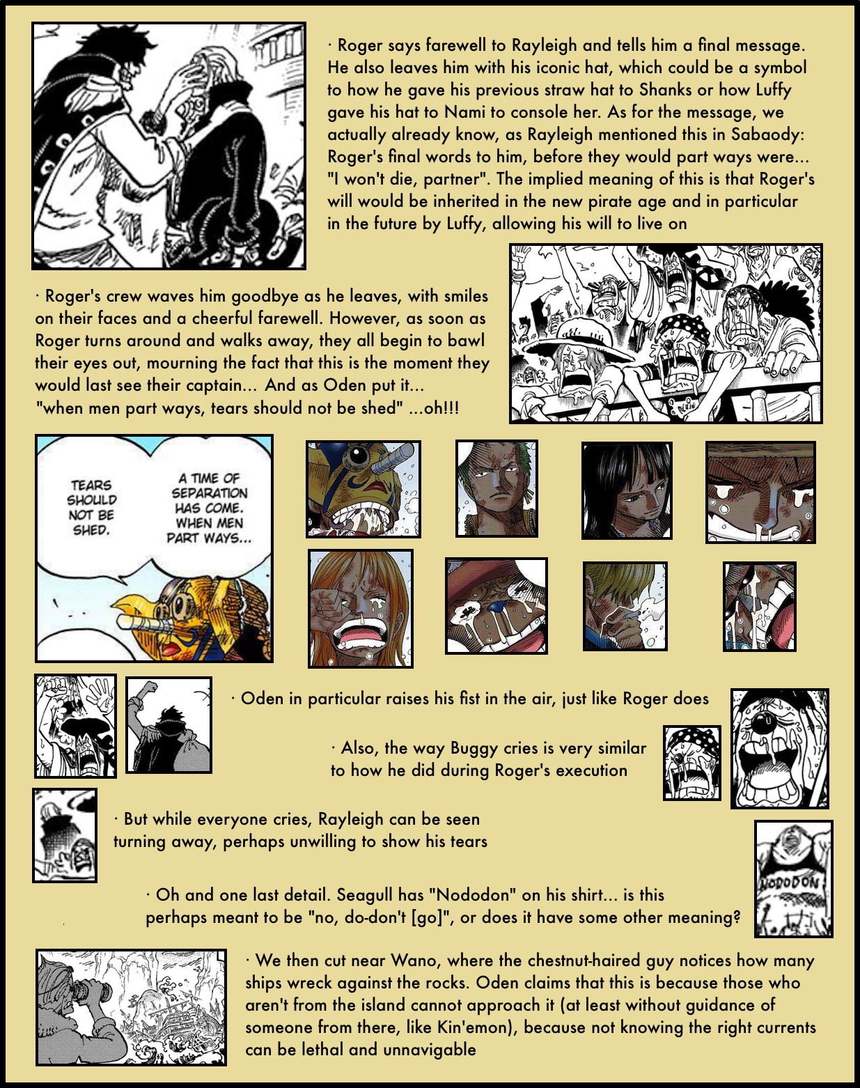 5. Great analysis as always. I was intrigued by Rayleigh’s reactions, you mentioned that he is the only one not seen crying during Roger’s departure, but it’s also the case when Oden leaves. He’s even smiling cheerfully there, while everyone else cries…