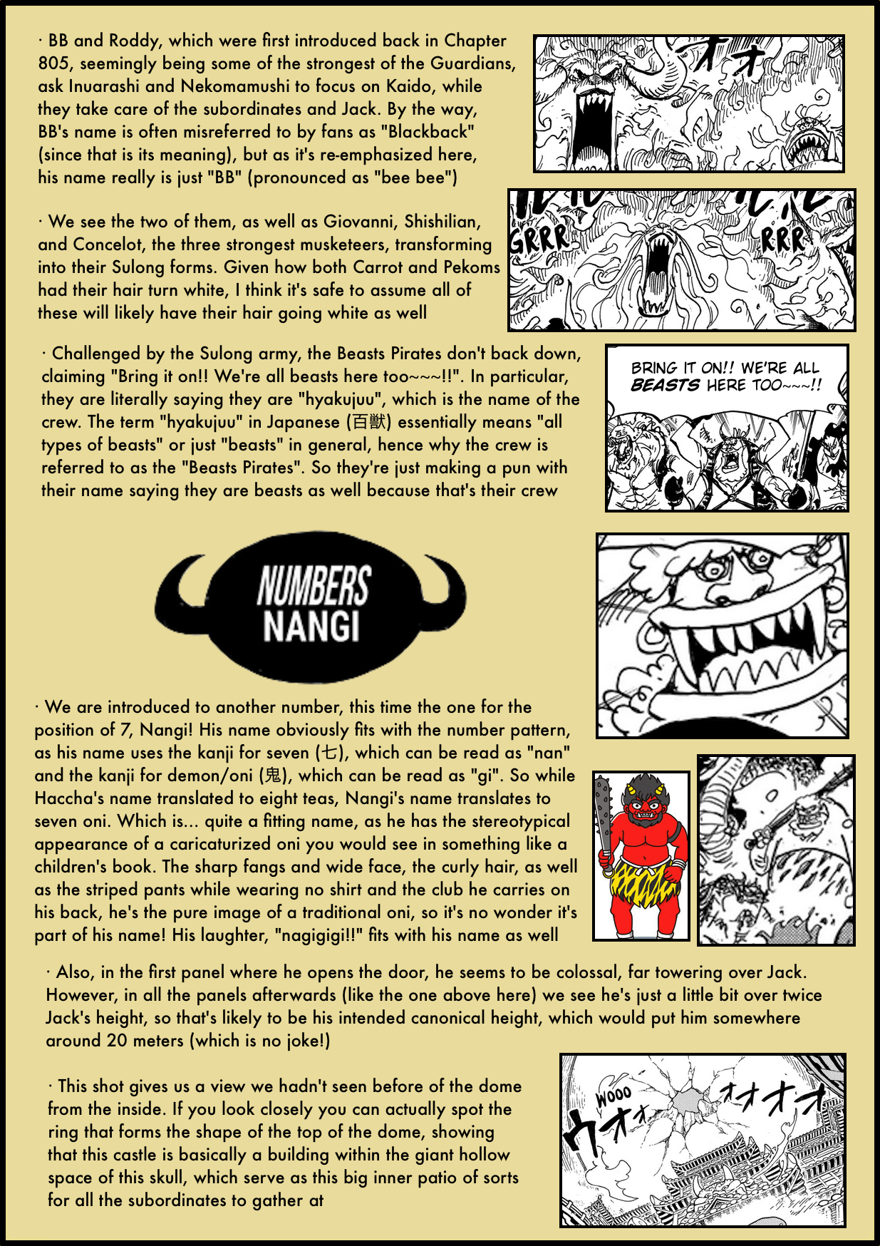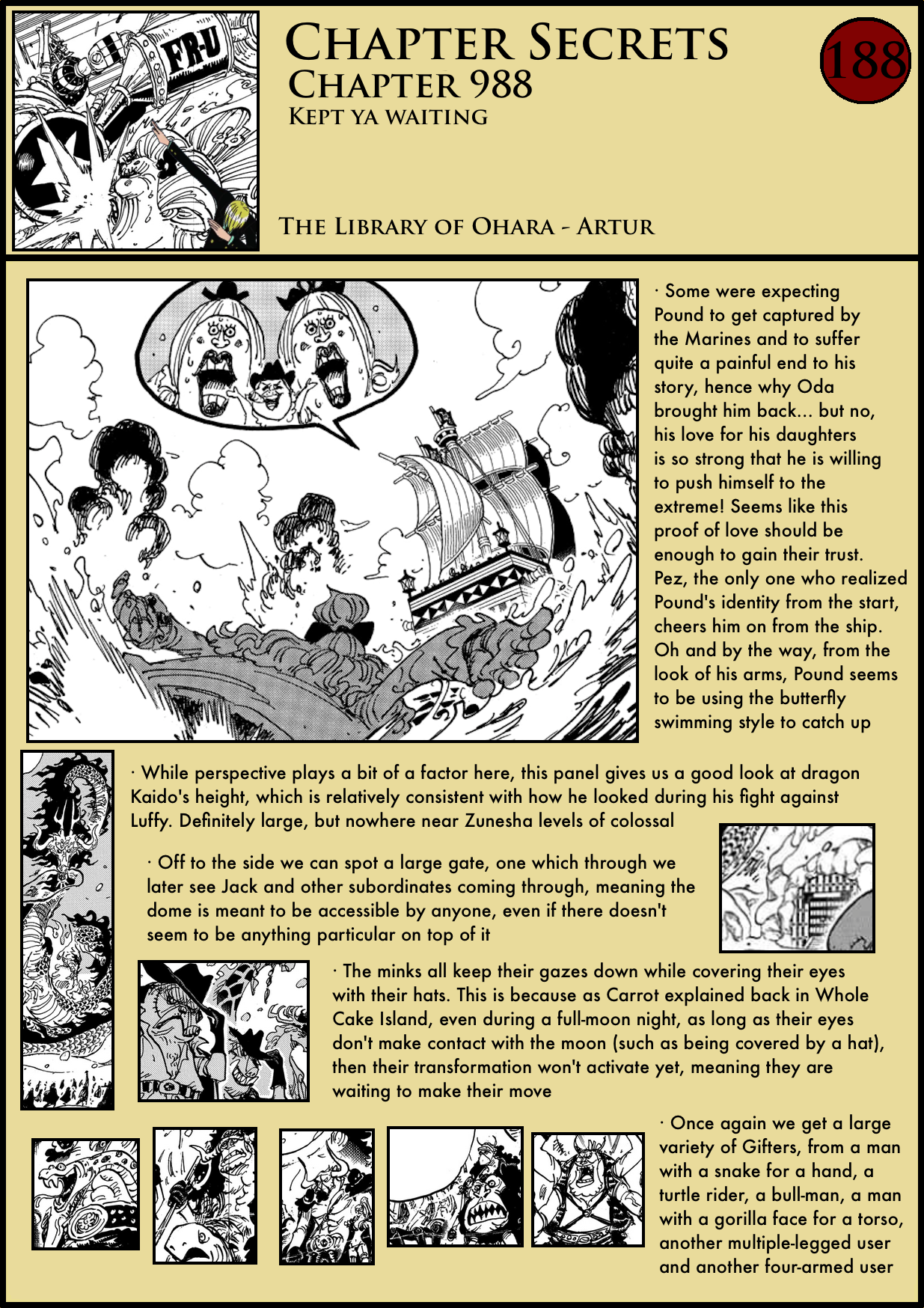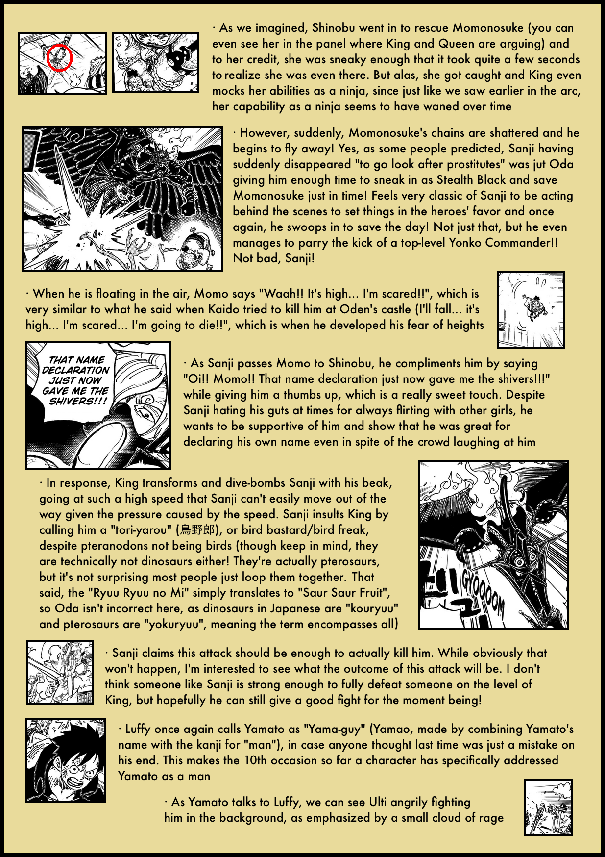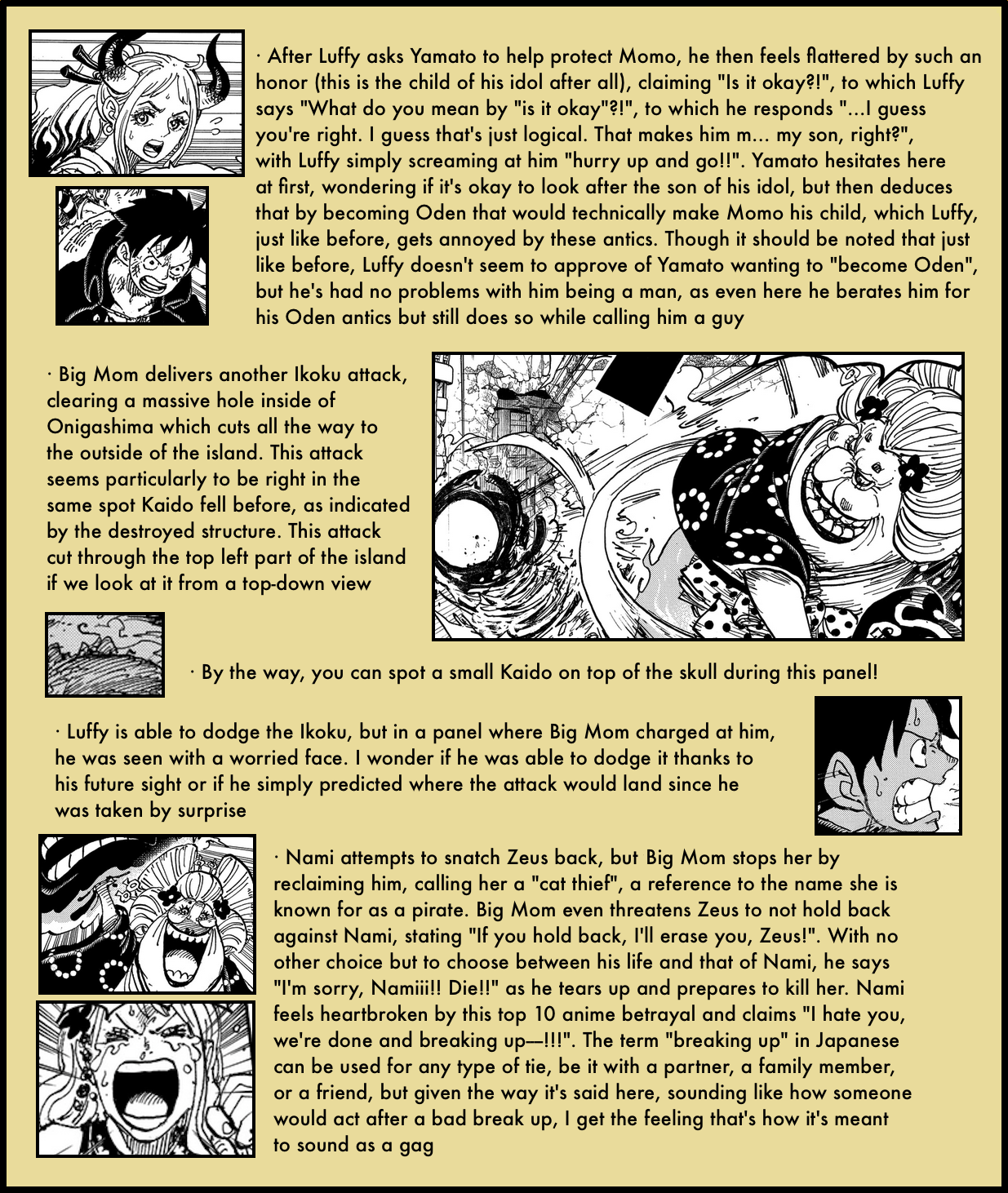 Regardless of whether it was a typo during the scripting/typesetting phase (I assumed that since typing in Japanese can easily lead to typing in the wrong kanji if you’re not paying attention) or an odd interpretation on the joke, I regardless don’t think it undermines anything. I feel a lot of people condemn even the slightest possible slip or controversial choice up as if it were “ruining the translation” or an “insult to the translation” which is ridiculous. I know a bunch of other JP-speakers in the community have taken some issues with some other choices in the past few Viz chapters (Kaido referring to his “army” when using 戦力, or Kin’emon not using “dawn” despite Oda having previously romanized it that way), but I don’t think we should obsess over any criticism people have. I’ve stated time and time again that the Viz translation is of impressive high quality and I’ve defended it even in a case like this, but I don’t think the community should be refrained from disagreeing with its choices and expressing how they may think it’s different. With how versatile, complex, and nuanced translating can be, I feel that the more people get to express their view on it, the easier it is to get to a general consensus.