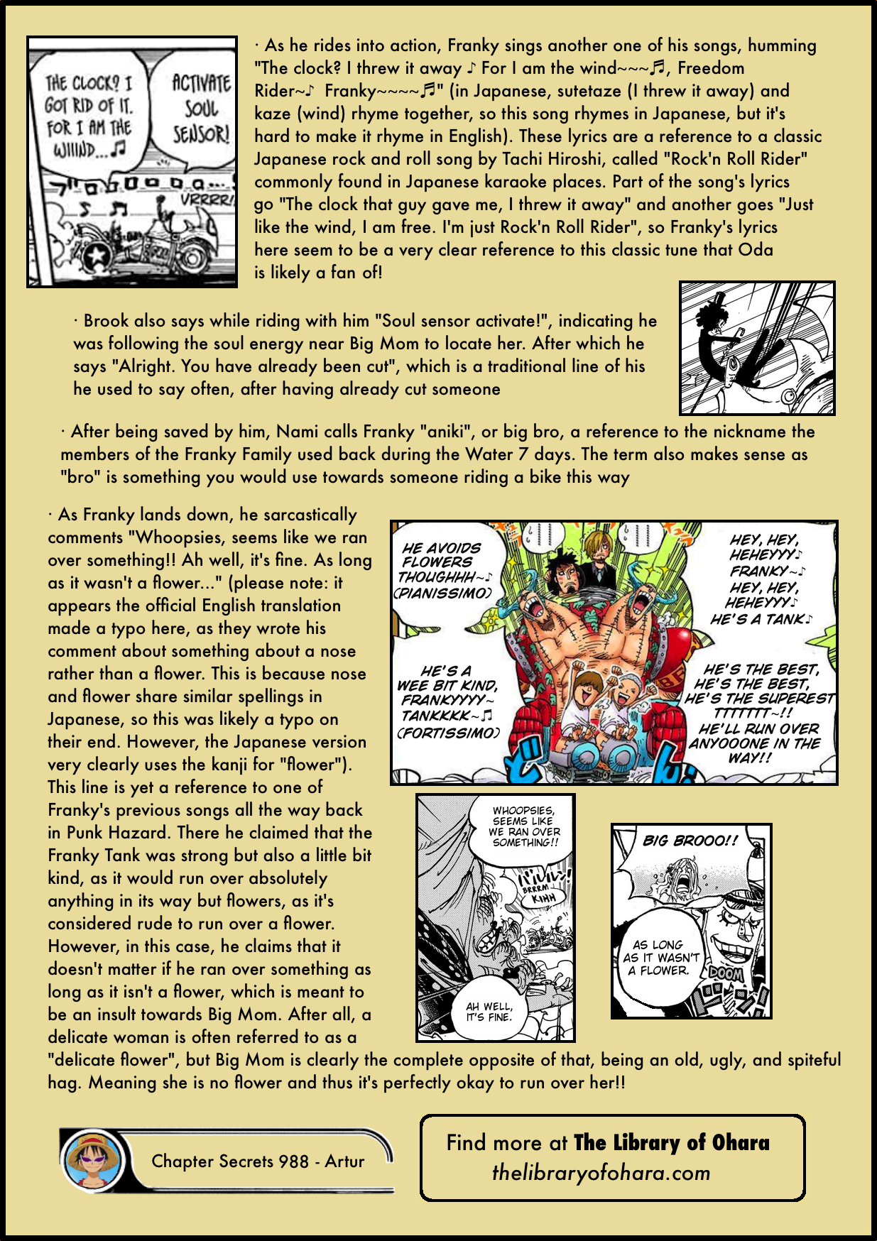 In Japanese, this is unmistakably meant as joke, saying “as long as it wasn’t a flower” but at the same time sounding the same as “as long as it wasn’t a nose”. This is obviously funny, because Frankie had in fact ran over a nose. Big Mom’s nose, of all noses.