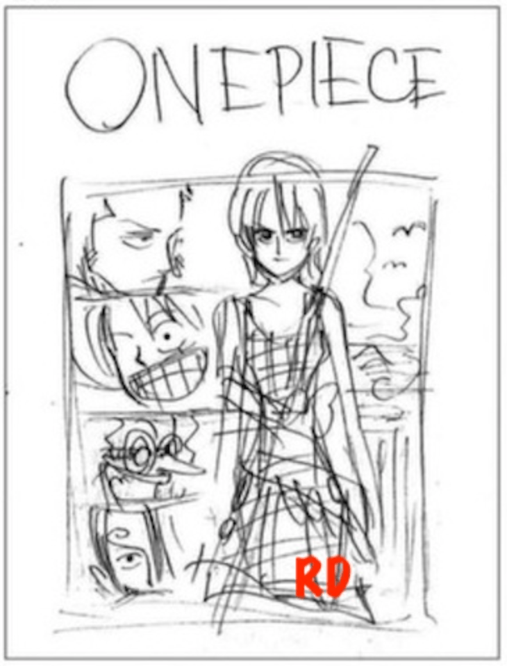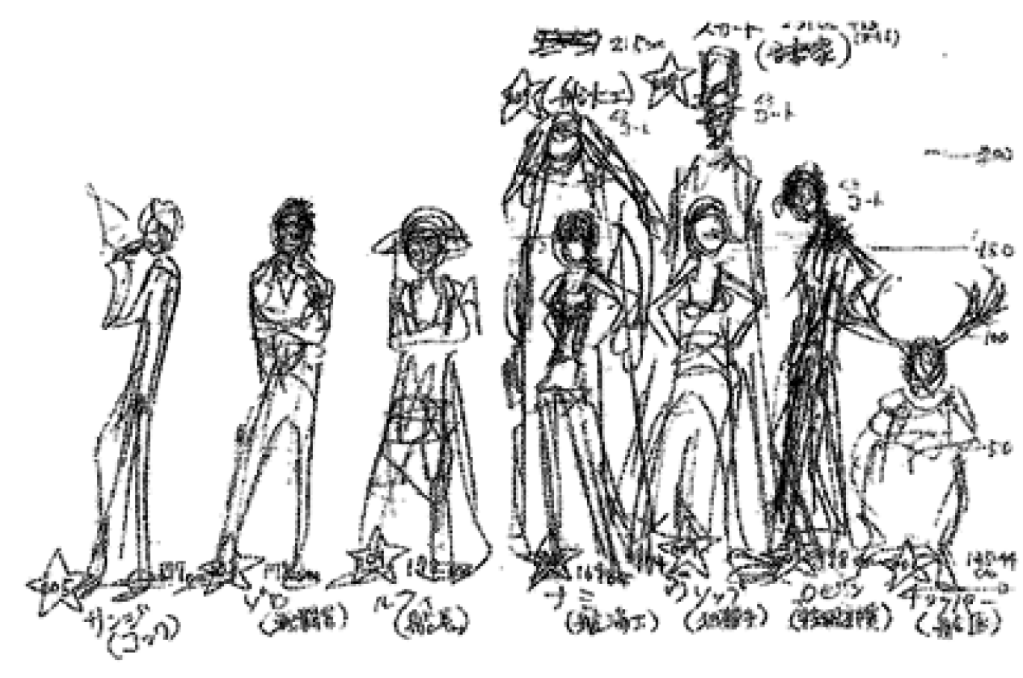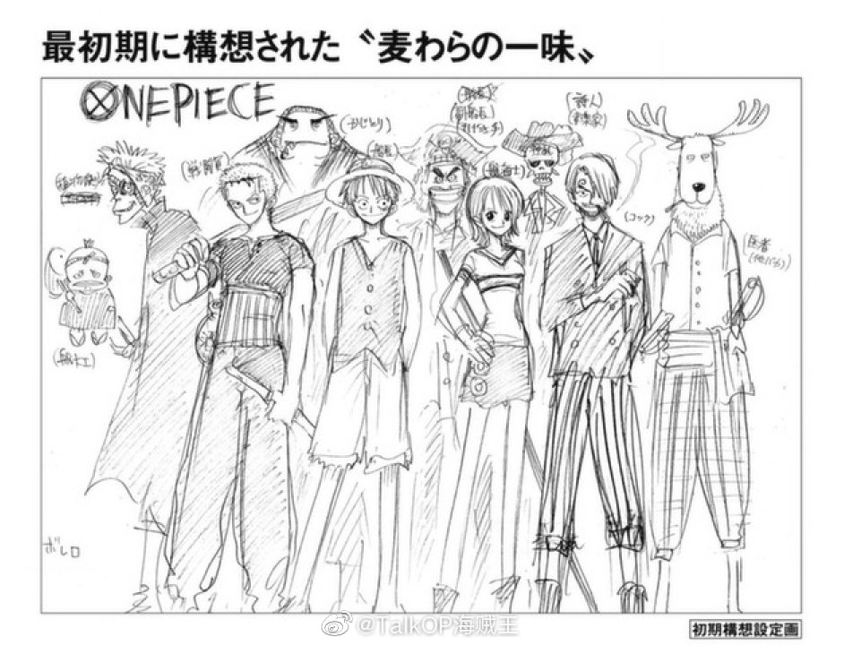 Here is an early version of the Straw Hat crew that Oda drew a couple years before serialization which includes a fishman who would serve as the helmsman of the crew, being Oda’s inspiration for Jinbe many years later down the line. This picture was once shown in an older databook, but this fishman was edited out to avoid spoilers it seems. That said, keep in mind Jinbe was originally meant to be a villain, so this was likely a different character all together, but Oda still ended incorporating Jinbe as the fishman helmsman of the crew many years later.