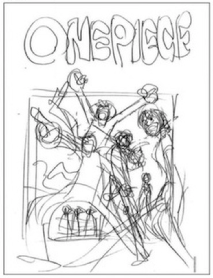 There’s also this sketch in that old databook which was drawn closer to serialization that features all Straw Hats, this time with Robin and Franky (but no Jinbe). Though this was most likely edited too in order to remove Jinbe, as evidenced by what looks to be traces of erasing.