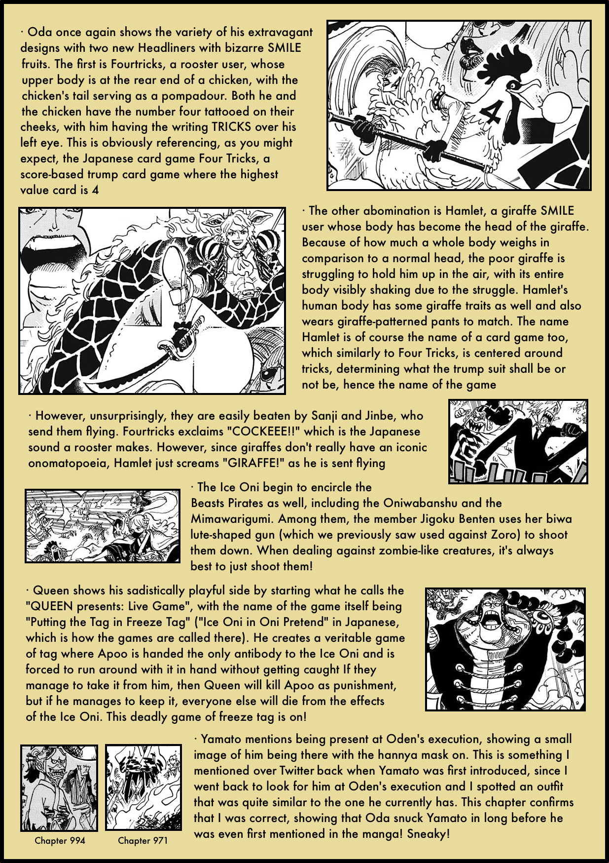 Come through for me Oda… Queen tried to kill Kidd and Killer, why not let them have revenge? And we all want Franky to suplex Queen at least once (if he can drive his bike into Big Mom’s face, surely he can do that right?) even if it’s not his main fight, or to have Marco skirmish a bit with King, even if it’s not his main fight. Make it happen!