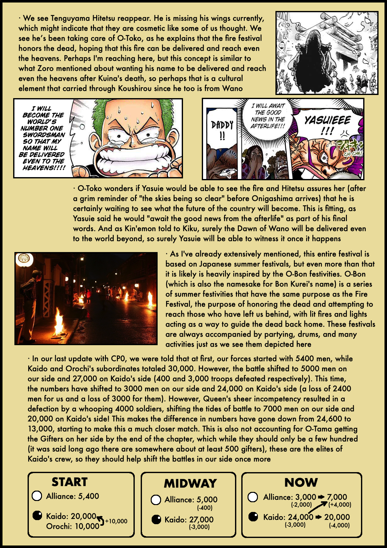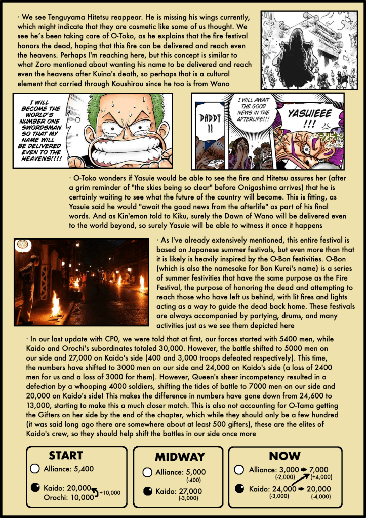 But yeah, definitely seems to be setting up for the final clash, just like Maxim/Noah/Birdcage the threat is looming and we’re seeing the townsfolk that would be affected by Onigashima falling.. just need Sanji v Queen and ..Marco? Vs King, should be Zoro but idk how unless chopper has some serious healing trick, then it should be down to Kaido.