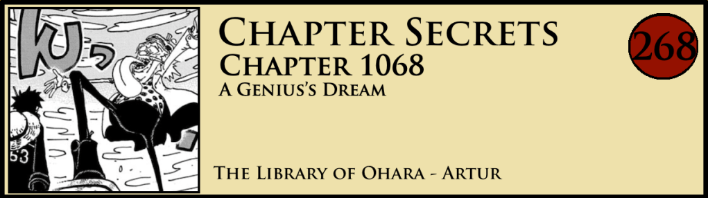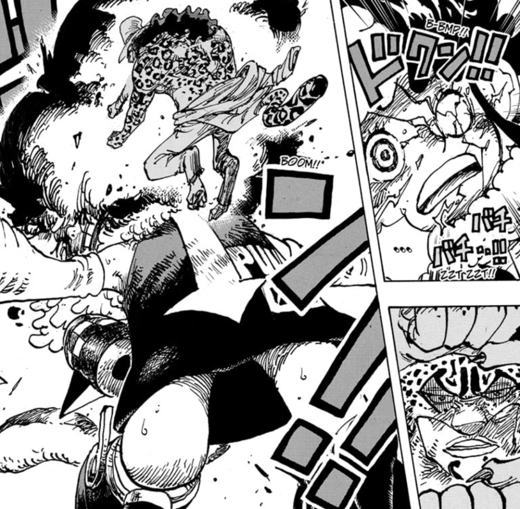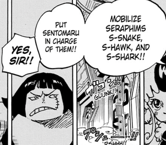 Well we may find out soon, as in a way to combat CP0, Shaka deploys the S-Shark we saw previously, as well as the S-Snake and the S-Hawk. This makes the naming convention of the Seraphim pretty obvious, since as you likely might’ve known, the Shichibukai are all named after animals. Mihawk is the hawk, Crocodile is the crocodile, Doflamingo is the flamingo, Kuma is Japanese for bear, Boa Hancock is the boa, and Jinbe is the Japanese name for “whale shark”. Gecko Moria is a special case as he is named both after the gecko, which is reflected in his final form where he turns into a gecko and one of his attacks, but is also the bat, which in Japanese is called “komori” and can be seen in his name, Gec-komori-a”. Beyond them though there’s also the new members including Weevil, which is obviously named after the weevil, as well as Blackbeard, Law, and Buggy. The latter three aren’t named after animals, as they likely weren’t named with the plan to become Shichibukai right away, but Oda has also given animal themes Teach being a hippo and Law a spotted seal just like the pattern of his hat, though Buggy still lacks one. This brings into question though on if we will see more Seraphim beyond the original seven Shichibukai, but we’ll have to see. Regardless, all of the deployed Seraphim are to be led by Sentomaru, who finally makes his return after all these chapters. In case you forgot, Sentomaru’s official position is being Vegapunk’s bodyguard, so it makes sense that he’d be on the island ready to lead the charge. Luffy did tell Sentomaru that they hope they can meet again one day, but perhaps this time it might be as allies rather than enemies, as Sentomaru is not only someone who respected Luffy as an opponent, but also likely has a stronger allegiance towards Vegapunk than he does to the Government, especially if Shaka trusts him with the Seraphim.