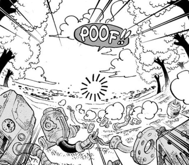 This could also potentially explain how the iron giant attacked Mary Geoise. I had speculated what if it once fell from the Red Line sinking into the sea, but regardless of where it ended up, perhaps some random landslide or something exposed it to sunlight once more, powering it up once again and leading it to fulfill its mission. However, as we see in the scene Vegapunk illustrated to us, on the day it attacked Mary Geoise it was seemingly cloudy and dark, so the sun being covered could’ve caused the iron giant to run out of the little energy it had left and collapse right then and there.