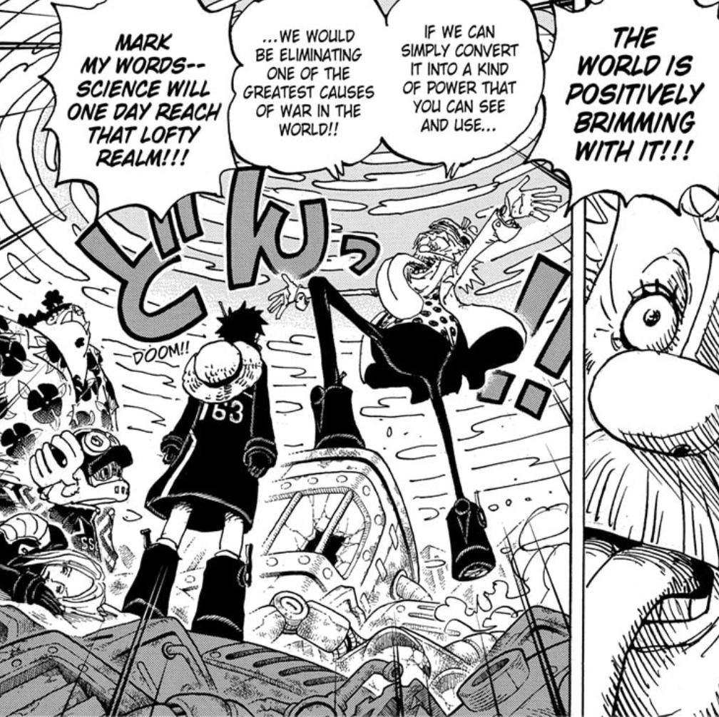 So Vegapunk illustrates to Luffy’s group what his ultimate dream is, wanting to create a world where energy is available to all in the world with no limits. As Jinbe explains, the world has been rife by many conflicts seeking natural resources. This is something we’ve seen firsthand in our adventures with the Straw Hats, such as the struggle over dance powder in Alabasta, or the struggle for vearth in Skypiea. After all, struggles for resources are a tale as old as time, something that the history of our world can show very clearly, as bloody wars have been waged for resources, from things as useful as soil and food, to even things like salt, which we might take as a commodity today, but back in the day were precious enough to becomes sources of conflict. In fact, though obviously there’s much more to it, part of the reason why several countries can live in peace today is because modern technology has made the access and distribution of resources to a larger population that much easier.