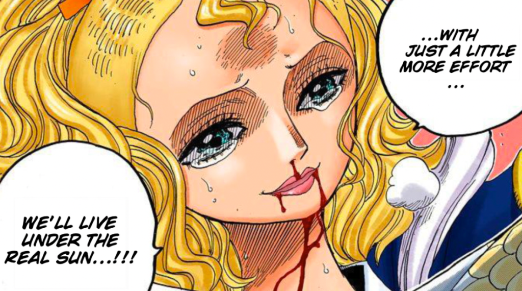 Speaking of all this, there’s also the fact that Kuma is now heading somewhere, which is almost certainly likely to be Egghead. It’s not clear how, but the way he’s rushing makes it seem as if he is panicking to save his daughter, so perhaps Vegapunk sent him some sort of distress signal or was able to provide him with some information in some way. As we’ve previously mentioned, it’s quite likely that Kuma isn’t actually dead, but that his original memory has been backed up somewhere and is now arising again once Vegapunk unlocks it. It’s even possible that just like Vegapunk did with the other punks, Kuma’s consciousness could’ve even been split amongst the Pacifista, potentially even the S-Bear, though that’s to be seen. This would explain why Kuma still has his fruit. We already knew this since Marineford, but if Kuma really did fully die, then supposedly he would’ve lost the powers of the Nikyu Nikyu no Mi, but him retaining them indicates a part of him must still be alive. Which is why now he uses the powers of the Nikyu Nikyu no Mi to send himself flying, likely to Egghead itself.