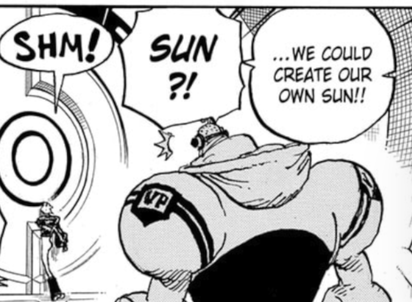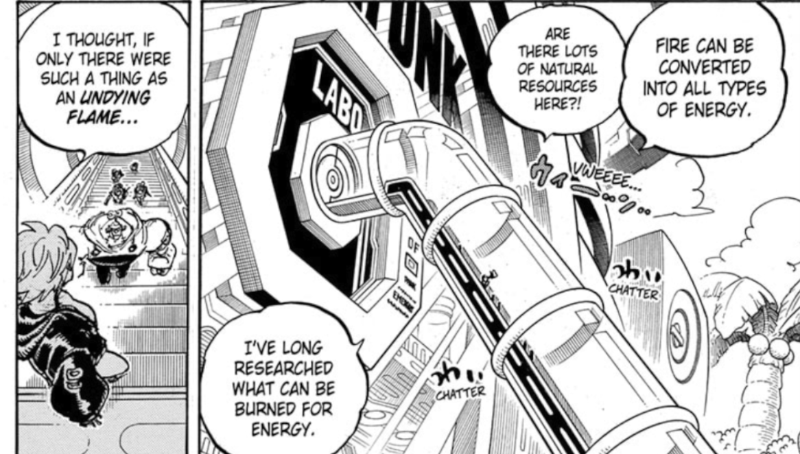So then, what is this mysterious resource that Vegapunk speaks that could be accessed anywhere in the world? Well, if you’ve been paying attention to what I’ve been saying so far you might’ve started to realize yourself, but we don’t really need to ask ourselves because Vegapunk already explained this a few chapters ago: Lilith told us that the island is powered by fire, with fire being able to become all types of energy. Franky questioned how they were able to get all this fire without natural resources, but Vegapunk clarified they’d been researching for a very long time what can become energy, seeking an undying flame that could power all this technology, so that they’d be able to create their very own… sun.