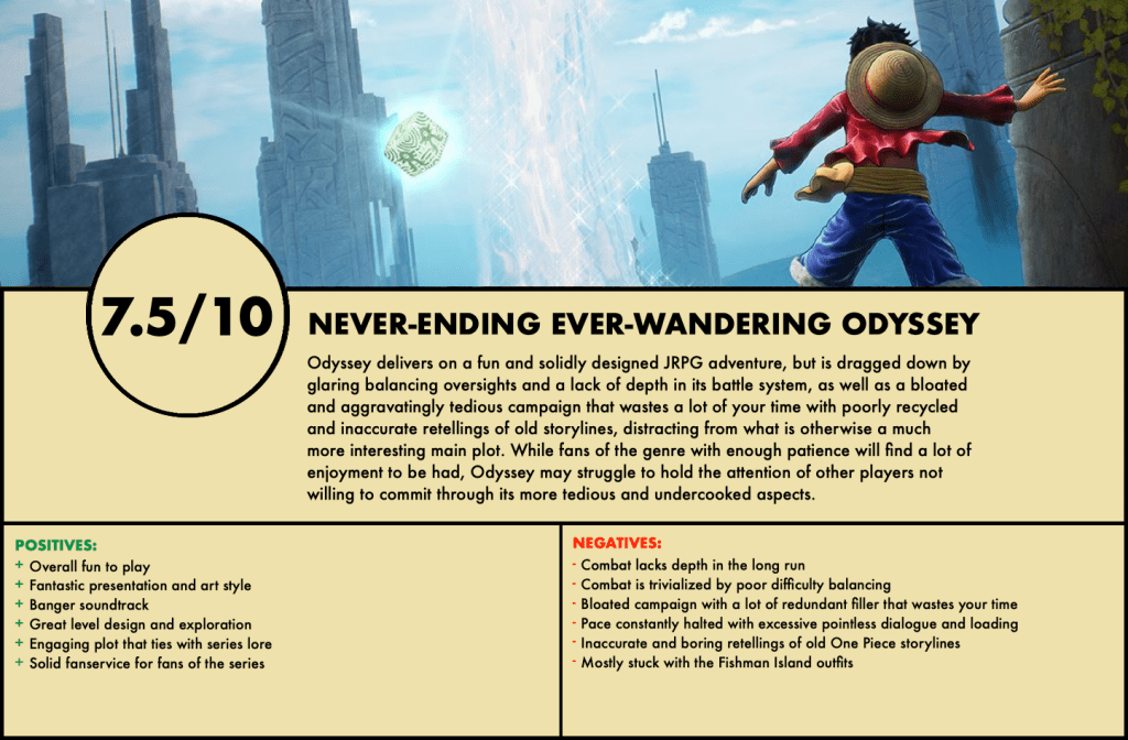 One Piece Odyssey is still at its core a great time, and I can’t deny that I still had a lot of fun with it. But alongside that fun also came a lot of tedium and boredom, as its flaws hold it back from being a truly immersive experience. Fans of classic JRPGs like me might still find a lot of enjoyment in the title as I did, but if you don’t have the patience to push through such a long and tedious experience that requires a lot of investment, then One Piece Odyssey may not be enough to hold your attention.