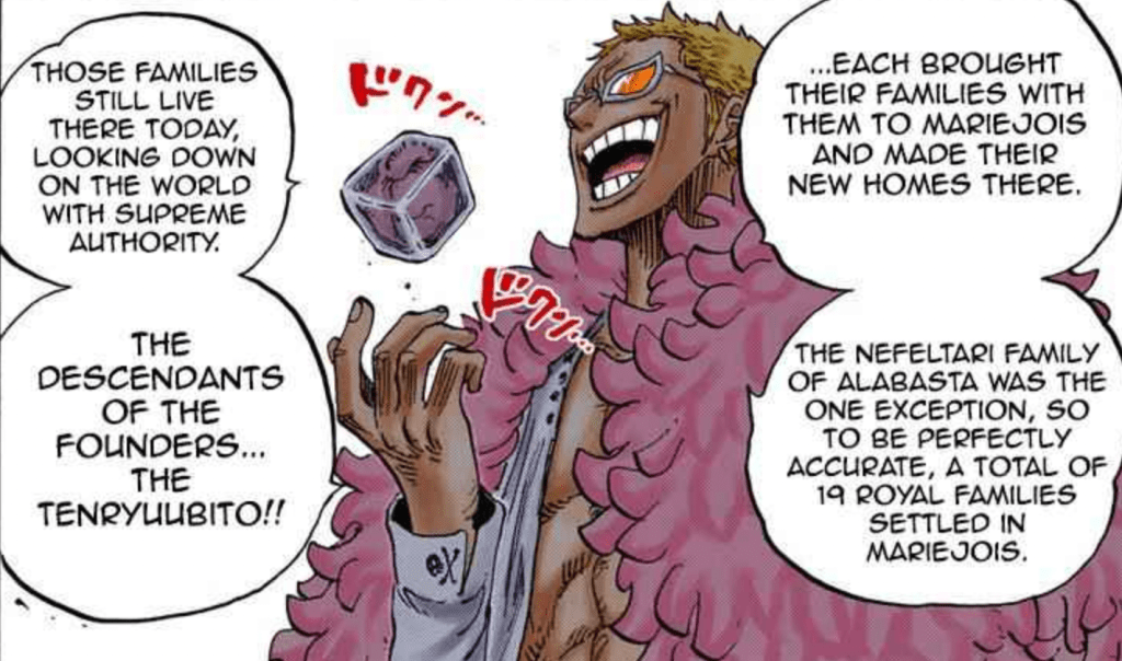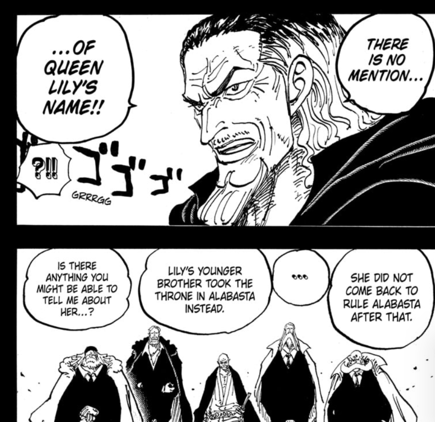 But as we know, as Doflamingo has told us ever since Dressrosa, the Nefertari clan was the only one that did not become a Celestial Dragon. The Queen of Alabasta in the Void Century, Nefertari Lily, was meant to return to Alabasta and continue ruling that country instead of joining the Celestial Dragons. This is already peculiar on its own, but even weirder is that… Nefertari Lily never returned from Mary Geoise.