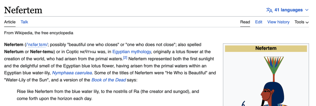 Because in ancient Egypt the blue Lily was not only considered a sacred flower and outright worshipped as a god, but known by the name of…. “Nefertem”. Which explains the name Nefertari in One Piece. In the Egyptian myth of creation, Nefertem is referred to having originated from the primordial sea, blossoming into a blue Lily flower in the form of nature itself during the creation of the world. This potentially ties with One Piece in the myth of the mother of nature, the sea, Umi, as well as the creation of the world by the Celestial Dragons.