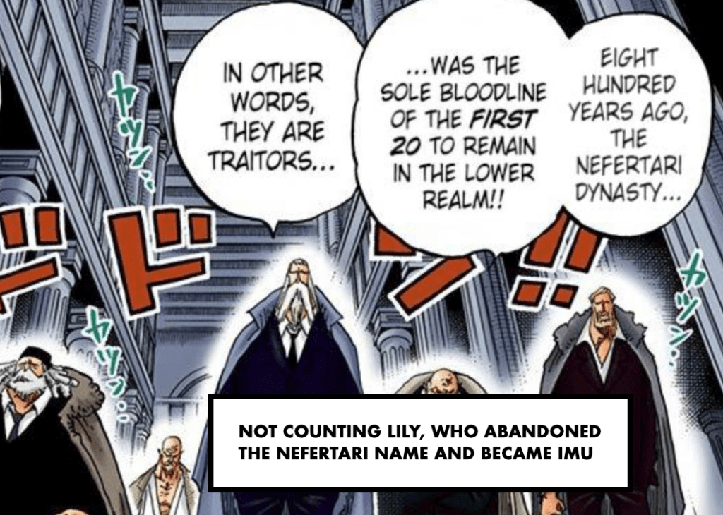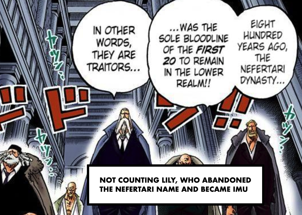 And well, once you think about it, it would make sense what became of Lily. If Lily never left Mary Geoise, unless she was killed, then the only other option is that she must’ve stayed there. Not as a Celestial Dragon, as she never pledged her sword upon the throne, but as someone else entirely. Someone who didn’t need to pledge her sword, because the swords were pledged to her. Someone above the Celestial Dragons who instead took over control of the world and decided to rule it from the shadows. Nefertari Lily, also known as the Goddess of the Sea Umi became Imu, the King of the World.