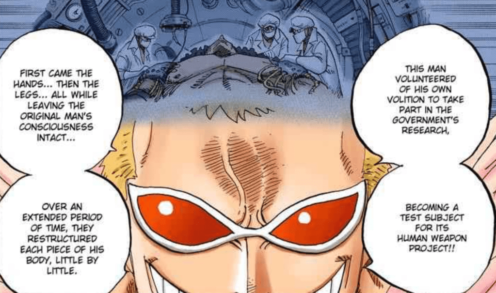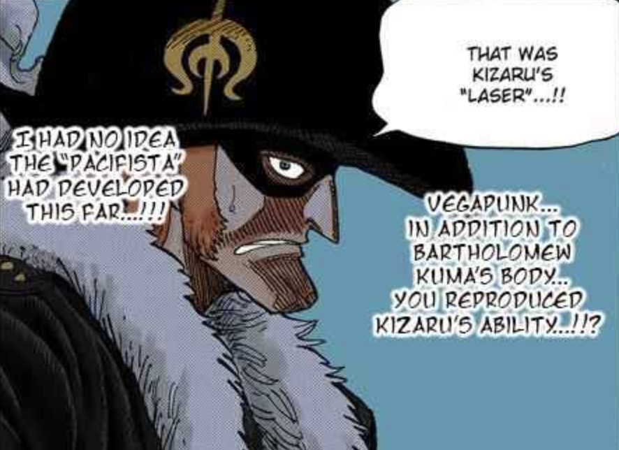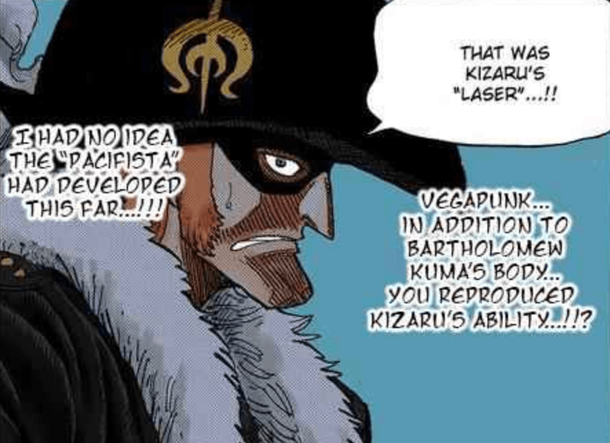 During Sabaody, Drake was confronted by a Pacifista, and he exclaimed “Vegapunk… in addition to Bartholomew Kuma’s body… you reproduced Kizaru’s ability as well…?!!” “I had no idea the “Pacifista” had developed this far…!!”. Drake had known about the Pacifista project, involving the cloning of Kuma, and Kizaru’s ability, because Drake was there when the Pacifista Project began during this chapter, finally explaining that bit of foreshadowing, which already told us that it was Vegapunk who cloned Kuma as well as replicated Kizaru’s laser devil fruit ability all those years ago.