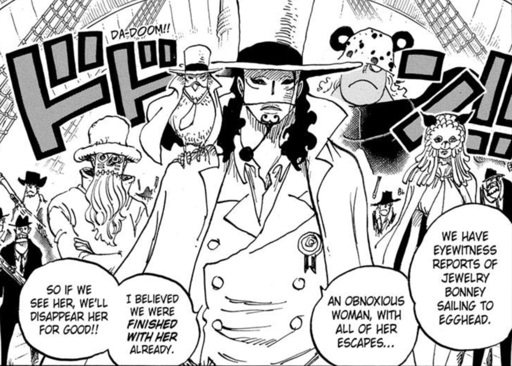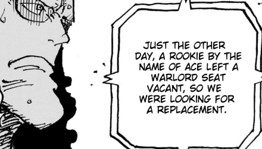 Robin informs Crocodile, who asks her if she has disposed of those that spotted their rain-making ship, referring to the Fool, the ship that used dance powder to cause civil unrest in Alabasta, as any witnesses of it would have to be disposed. Behind them, a bananawani can also be seen chilling. We also see Mihawk, Hancock, Koby and a very delusional Alvida, and Ace, now part of the Whitebeard Pirates, alongside Whitebeard, Marco, Jinbe, and Teach, the year prior to Teach killing Thatch and stealing his fruit. Interestingly, Saturn stated “The other day, thanks to a rookie called Ace, we are left with a vacant Warlord position”. It’s unclear what this is referring to, as it could refer to Ace having defeated a Warlord and thus leaving a position vacant, or it could also more simply refer to the time when Ace rejected the offer to become a Warlord, so Saturn could be frustrated they couldn’t fill it in with Ace. The wording in Japanese is quite vague, so it’s hard to say for sure.