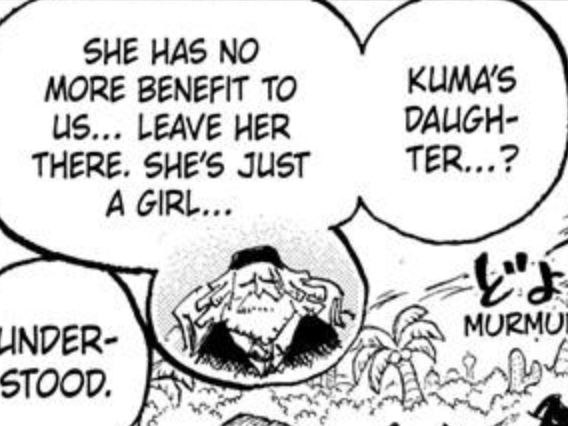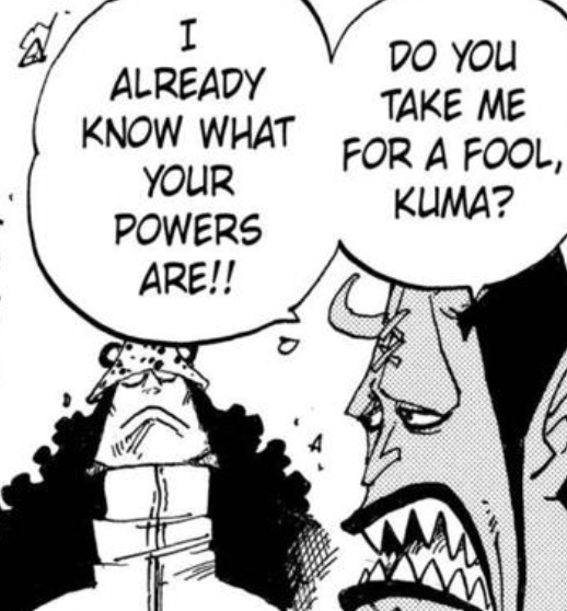 Just as we had deduced last chapter, Saturn forced Kuma into an agreement, forcing him to become a Warlord and augment his body as a cyborg, which was not part of Vegapunk’s original plan. However, as most Warlords do not follow orders, Saturn demands for Kuma to abandon his sense of will and be fully controllable. This is why Kuma was famously known as the most obedient of the Warlords, always following each of their orders, which made Moria wonder what his true motives were, something we now finally know.