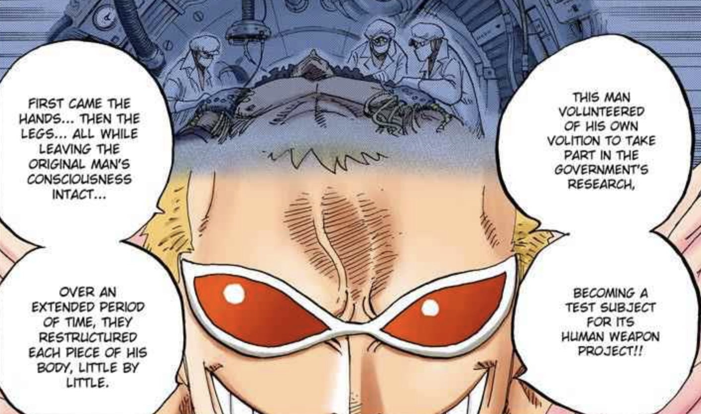 Following, we see Kuma beginning to go through his treatement, and as a cool detail, the machine where he is being treated is the exact same that we saw in the brief flashback image of Kuma being modified all the way back in Marineford, showing a nice degree of consistency. The modifications on his shoulders are very similar to those shown in that panel too. And to top that off, Vegapunk’s outfit during this first encounter is also the same that Kuma depicted him in when we first caught a glimpse of him 15 years ago, with gloves and a striped shirt.
