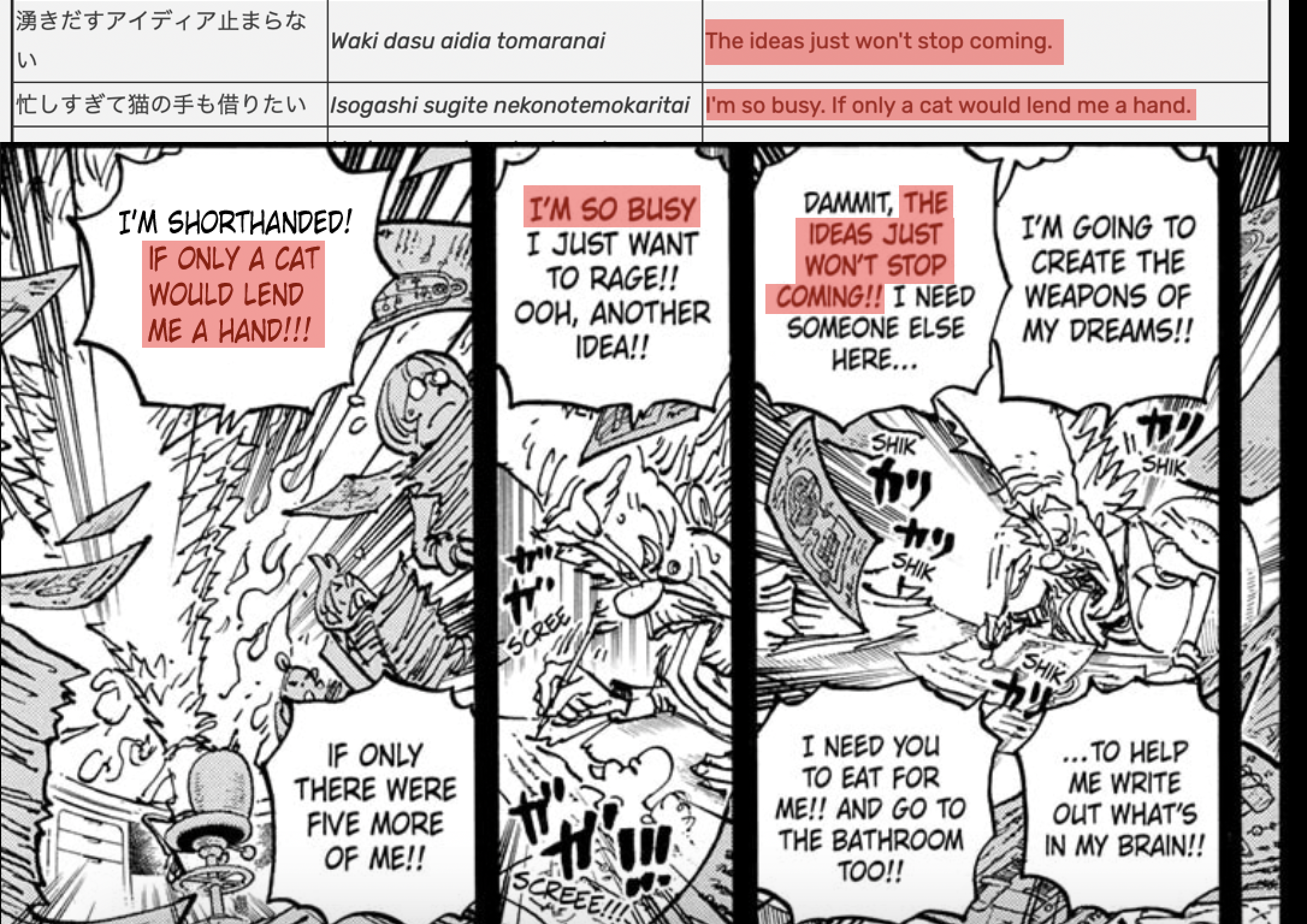 Vegapunk then begins developing the Pacifista, but begins to express how he wishes there were several more of him that could help him, expressing that he wishes “a cat could lend him a hand”. This is a Japanese expression that essentially means having someone lending you a hand, which is the reason behind the Satellites having the kanji reading for “cat”. As a small detail too, some of these lines Vegapunk utters, are lifted word by word from the Egghead promotional video by Calliope Mori, which Oda expressed greatly admiring and liking.