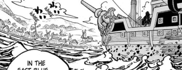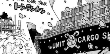 Across these panels we can also see what would be Egghead beginning to be built up, with cargo of materials arriving on the island to erect all the buildings. On the ship is the writing “Umit Cargo Ship”, and this is actually quite the deep reference, as it’s referring to Umit, one of the Emperors of the Underworld who attended Big Mom’s tea party. He is known as a shipping magnate, called the “Deep Ocean Current”, who provides materials all across the world. The symbol on the ship even resembles that of his hat.