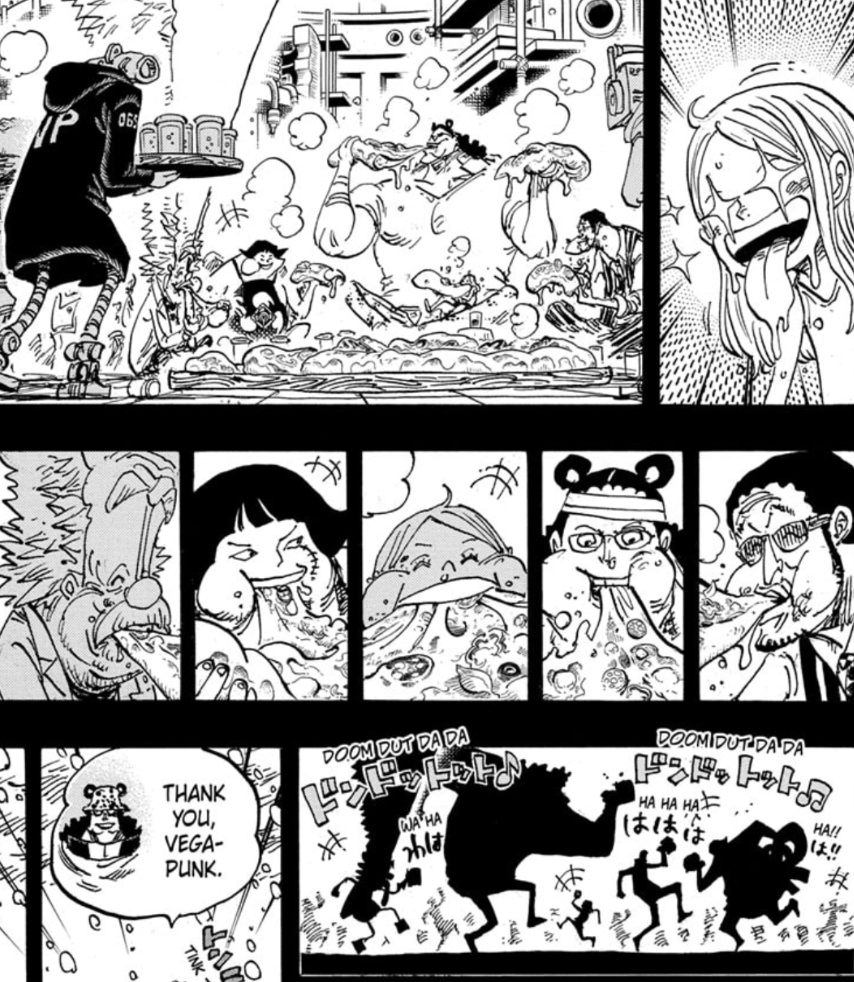 We then also see Kuma, Bonney, Vegapunk, Sentoumaru, and Kizaru eating a giant pizza all together, which showcases to us how these people all became close together, only to fatefully end up fighting the Straw Hats side by side in Sabaody. Bonney’s expression when seeing pizza, her favorite food, is the same one Ginney had when seeing food. And in a nice touch, by the end of it, they all end up dancing to the tune of Nika, as they sing out the Drums of Liberation. This also explains why Sentoumaru saved Bonney and why Kizaru was struggling to hurt her.