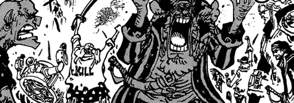 However, let’s backtrack a little bit. Going back to the panel at Hachinosu, you can actually spot there what looks like to be Don Krieg! But not just him, accompanying him is actually… Gin! After years of memes, theory, and speculation, finally Gin makes it back to the story! As he said, he kept believing in Don Krieg, but it seems the two were humbled enough to actually take strengthening themselves seriously and actually made it all the way to the New World! Krieg himself now appears to have longer hair and generally looks a lot tougher and more respectable than the delusional man he once was. At the same time though, it doesn’t stop there because opposite to them is what appears to be Pearl! The other member of the Krieg Pirates who covered himself in this iconic massive steel plating, who has seemingly made it all the way to the New World with them as well.