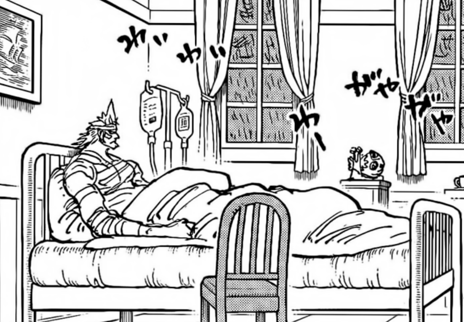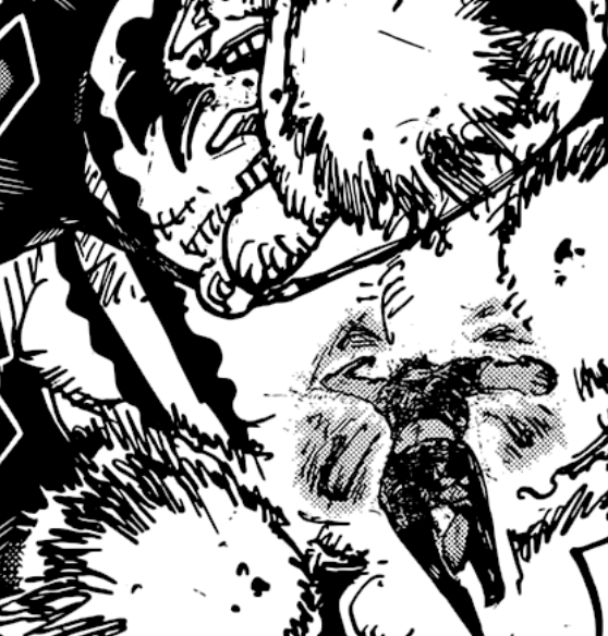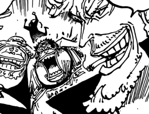 Shockingly enough though, X Drake also makes his appearance. Last we knew of him, he was pretty fatally wounded in Onigashima and passed out next to Hawkins, with Prince Grus mentioning as late as almost an entire month later that they still couldn’t get in contact with him. But I suppose that miraculously, Drake managed to pull himself together, survive, escape Wano, and then sail all the way to G-S to receive further care. Either he got help from the Straw Hats but that was off-screened, or he really pulled this off all on its own! Even if it’s yet another case of characters refusing to die, it’s at least impressive he’s made it this far. As a small detail though, you can spot the den den mushi on the side having the same sideburns he has, and this is also one of the first times we see him properly unmasked in the present.