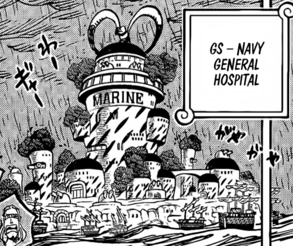 We then cut to the general hospital at G-S, which is a Marine Base that is likely meant to be GrandLine Base “SWORD”, in this case serving to heal the injured SWORD members, unlike the other numbered G bases. Them having reached it in less than a day would indicate it’s not that far from the Egghead/Hachinosu area. It’s quite a massive base, as comparing it to the size of battleships surrounding the island, which we now know are about 60m wide, the base itself is about twice that size, making it at least about a couple hundred meters tall. Atop it is of course the symbol of the Marines, being the seagull.
