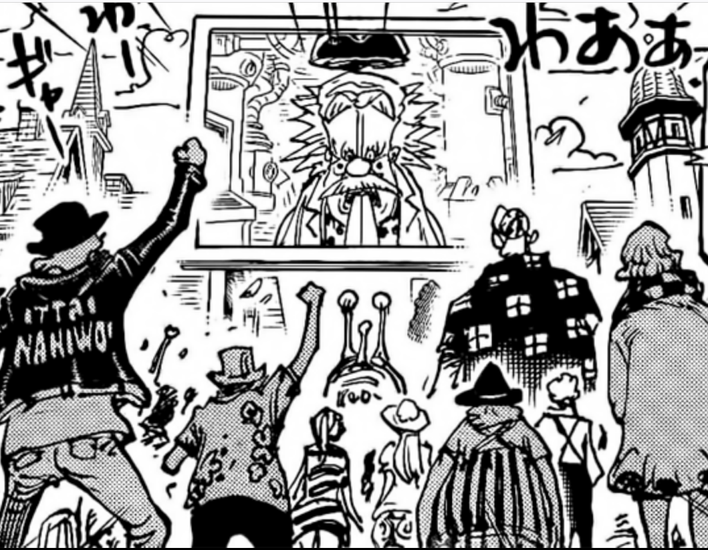 All the Gorosei, aside from Nasujuro who is above, quickly gather around the Iron Giant, in an attempt to close the transmission. We see yet another country of Eastern appearance reacting to Vegapunk’s words. Given the tall peaks and the architecture, it’s possible this may be the Kano Country, the country from where Don Sai of the Straw Hat Grand Fleet originates, which is inspired by real life Korea, known as the “Kan Country” in Japanese. Focusing on Vegapunk’s message though, in his final words he mentions: ”And one last thing… allow me to deliver a message. To those bearing the name “D.” scattered across the world. Within you, there’s another mo-“