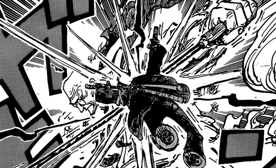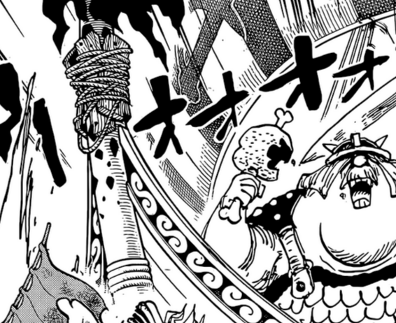In this case however, Nasujuro is stopped as Jinbe propels Zoro with an attack called “Gyojin Jujutsu, Kataguruma”. This is a new move of Fishman Jujutsu which literally translates to “Piggyback Ride”, but in this case it’s a pun as the kanji used for this term reads as “Shoulder Car”, as Jinbe is literally throwing Zoro with an over the shoulder throw.