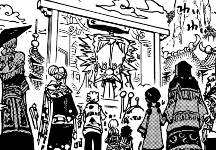 Zoro then follows up with a Nitoryuu, or two sword style move, called “Gokuraku Anyou Rashomon”. This is an enhanced version of “Rashomon”, a move that he originally used in the sea train to cut the train cars in half to open a path. Rashomon refers to the city gates that would allow entrance to great old cities like Kyoto, and are thus meant to create a path forward. In the case of the sea train Zoro was opening the path for them to continue, and in this case you could argue Zoro is opening up a path for them to escape. The additional preface here however furthers a deeper joke. “Gokuraku” refers to heaven, paradise, whereas “Anyou” refers to providing a place for the elderly. So in other words, “Gokuraku Anyou” means “providing the elderly with eternal rest to heaven”, which combined with the gate of Rashomon could be interpreted as Zoro opening “the gates of heaven” for Nasujuro. This is fitting not only as a fitting jab at Nasujuro that he is so elderly Zoro is figuratively trying to bring him to the gates of heaven, but it’s all just fitting due to the fact they are on a sky island where heaven would theoretically be to begin with.