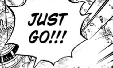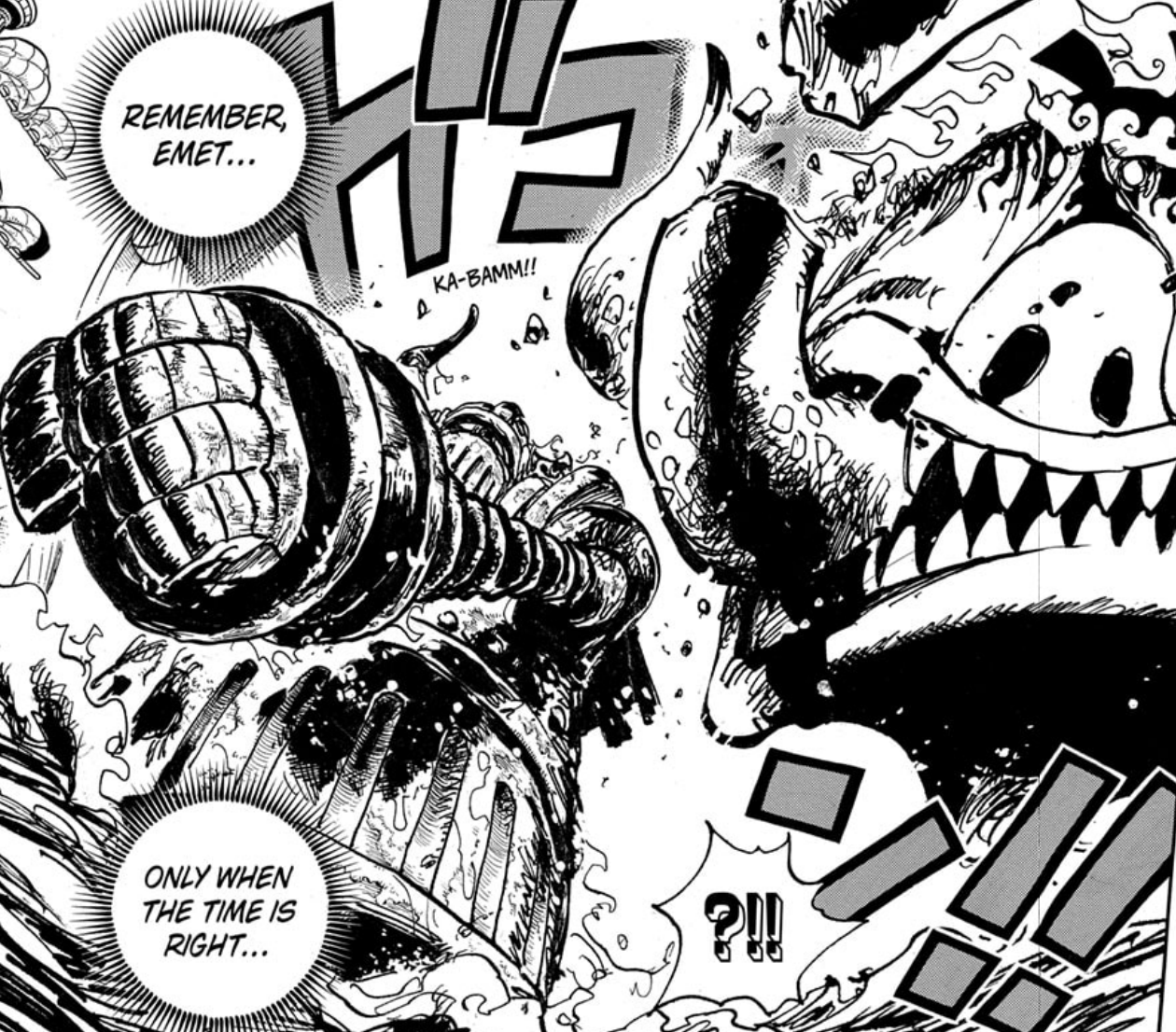 What is more interesting however, is that the iron giant appears to have an inner dialogue as a memory. It exclaims “Joyboy”. The interesting thing here is that Luffy seems to react to the iron giant. To be fair, he could be simply using his observation haki or future sight, but in this case, I wonder if Luffy could actually hear the giant’s own voice calling out to him through the voice of all things, or if I am reading too much into this. But the iron giant follows this inner dialogue by recalling a memory with… none other than Joyboy!! Being the first time we ever hear the voice of Joyboy, and likely will in the anime some year and a half from now! Joyboy simply tells it “iika Emeto, izatte toki da”.